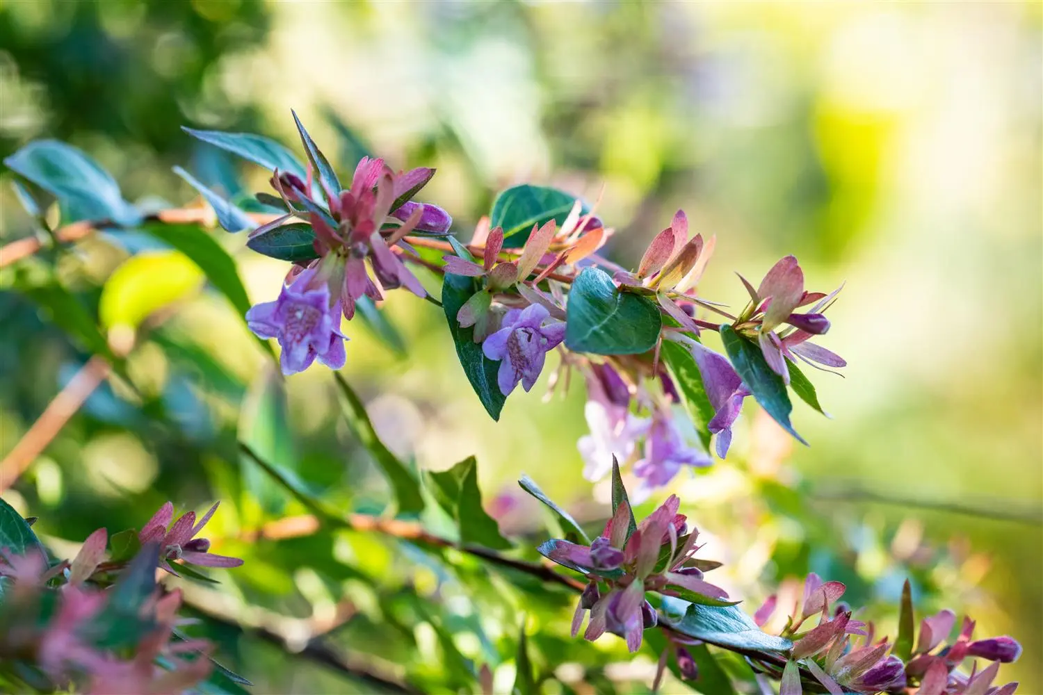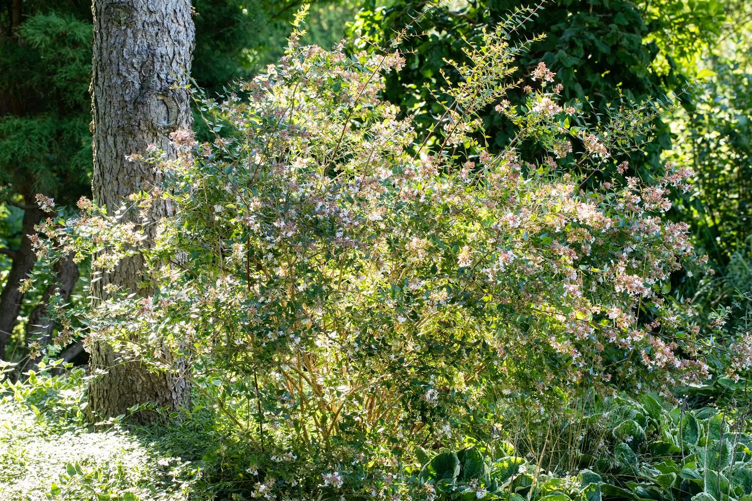 The Abelia 'Edward Goucher' (Abelia grandiflora) is a bushy, dense, broad shrub that produces light pink, bell-shaped flowers with a pleasant fragrance. They appear from July to September. The Abelia 'Edward Goucher' also has lanceolate, dark green leaves. In a sunny to semi-shady, wind-protected location with well-drained, humus-rich, nutrient-rich soil, it usually reaches a height of around 1.5 m and is around 1.75 m wide.