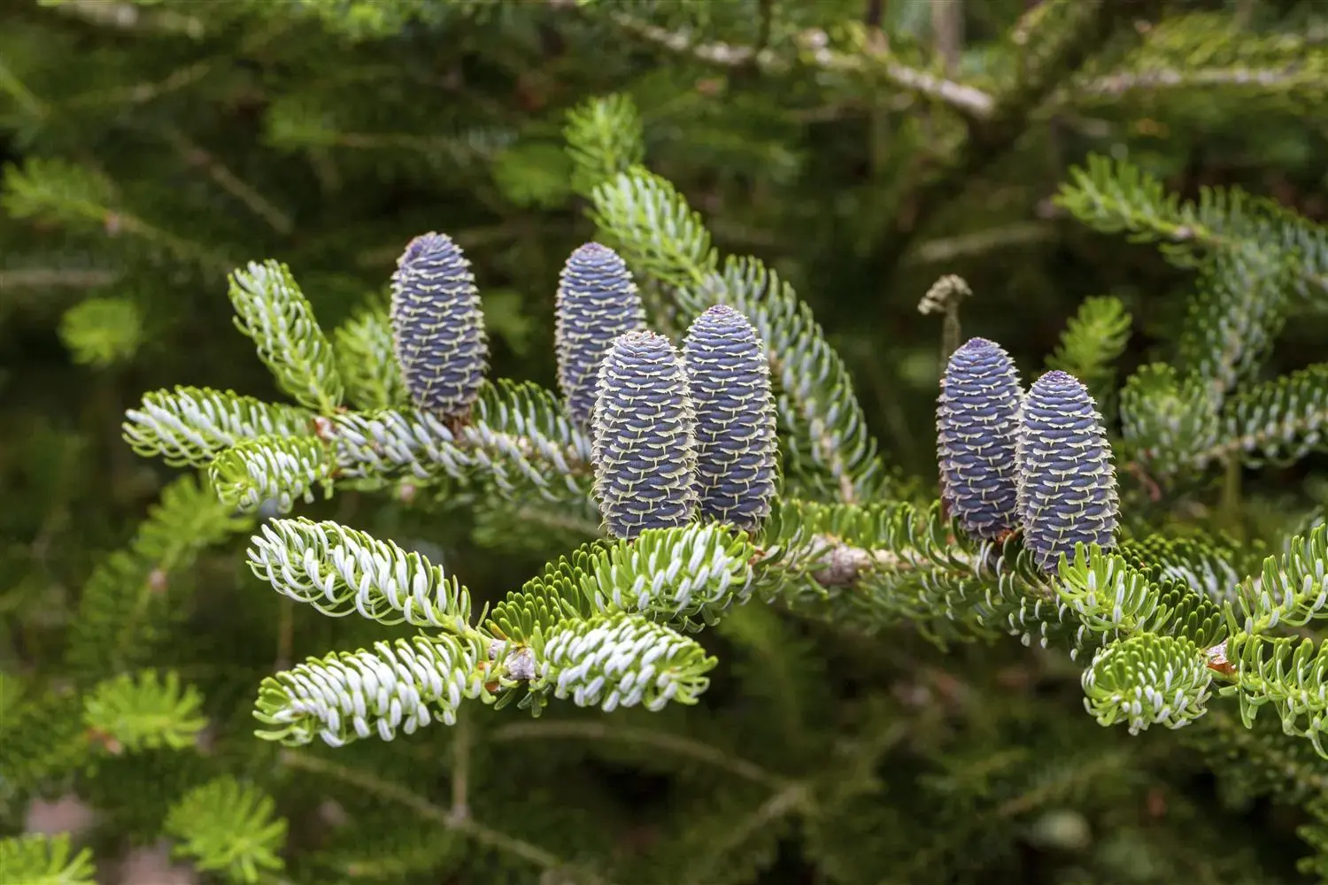 The Korean fir 'Silberlocke' (Abies koreana) is a tree that grows pyramidally and usually reaches a height of about 7 metres and a width of about 2 metres. Its needle-shaped leaves are silver-blue in colour. Decorative cones adorn Abies koreana 'Silberlocke' from October. This shrub is well tolerant of frost and prefers humus-rich, nutrient-rich, slightly acidic soil in a sunny to semi-shady position.