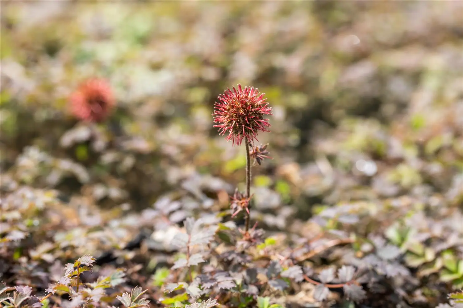 The New Zealand bur 'Kupferteppich' (Acaena microphylla) is a creeping, cushion-forming, winter-green perennial with decorative, pinnate, toothed, red-brown leaves. It bears white, ball-shaped flowers from June to July. Decorative purple-red fruits develop from the flowers in September. In a sunny to semi-shady location with well-drained soil, it usually reaches a height of approx. 10 cm and grows to a width of approx. 30 cm. The New Zealand bur 'Kupferteppich' is well tolerant of frost.