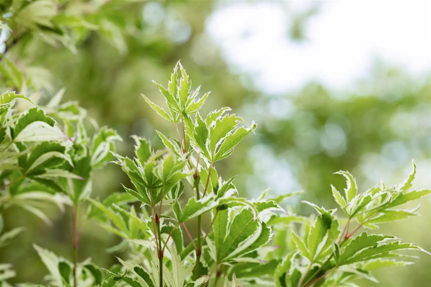 High leaf ornamental value. The deciduous leaves of the Japanese maple 'Kagiri Nishiki's are blue-green, cut, opposite, lobed and have a white margin. They are about 6 - 11 cm in size.