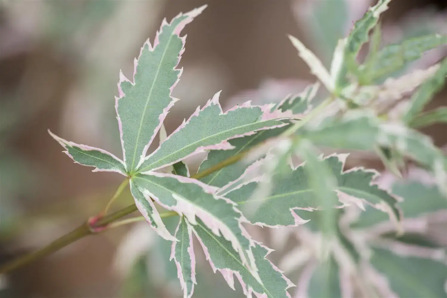 High leaf ornamental value. The deciduous leaves of the Japanese maple 'Asahi-zuru's are multicoloured, cut, opposite, lobed. They are about 6 - 11 cm in size. Pink-coloured, early shoots. Japanese maple 'Asahi-zuru' turns bright pink in autumn.