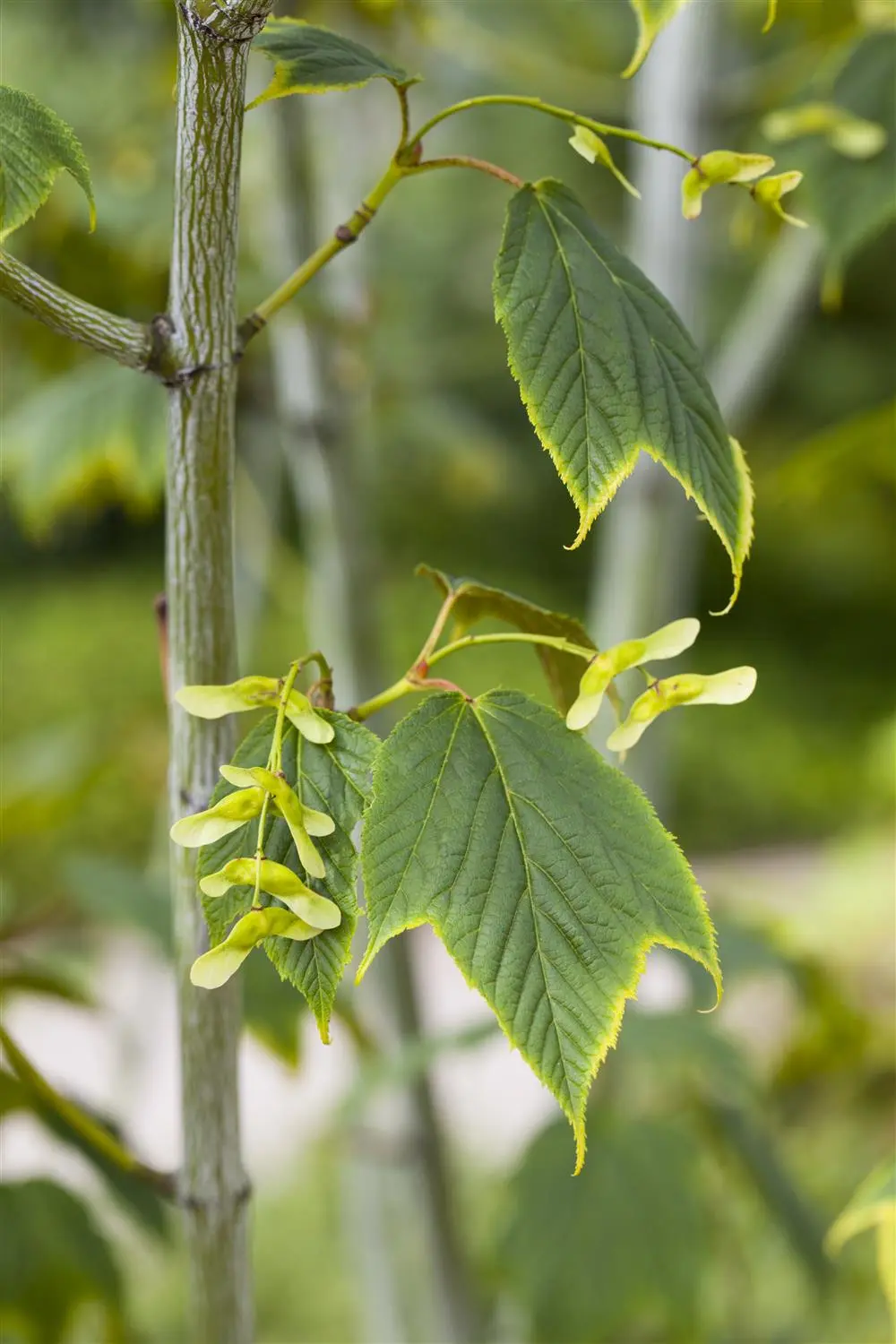 The Moosewood (Acer pensylvanicum) is a loose, multi-stemmed small tree that produces light yellow flowers arranged in clusters. They appear in May. These produce light brown winged fruits. The Moosewood also has dark green leaves. Its bark is green-white, striped and smooth. In a sunny to shady location with well-drained, loose, acidic soil, it usually reaches a height of around 9 metres and grows to around 6 metres wide.