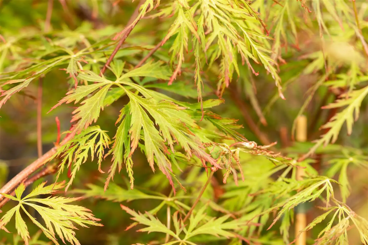 The deciduous leaves of False Siebold's maple 'Ice Dragon'® are medium green, deeply slit. Red-orange shoots. False Siebold's maple 'Ice Dragon'® turns bright red, yellow to orange in autumn.