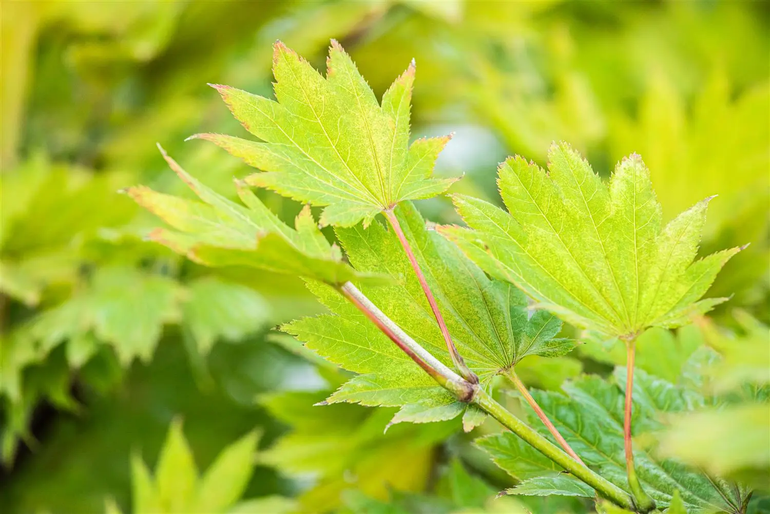 The Shirasawa maple 'Aureum' (Acer shirasawanum) is a dense, rounded, deciduous shrub with decorative, yellow-green, red-veined leaves. The light yellow shoots are also an interesting sight. It also bears creamy white flowers from May to June. These produce red winged fruits. In a semi-shady, wind-protected location with well-drained, humus-rich, weakly acidic soil, it usually reaches a height of around 4.5 metres and grows to a width of around 4.5 metres.