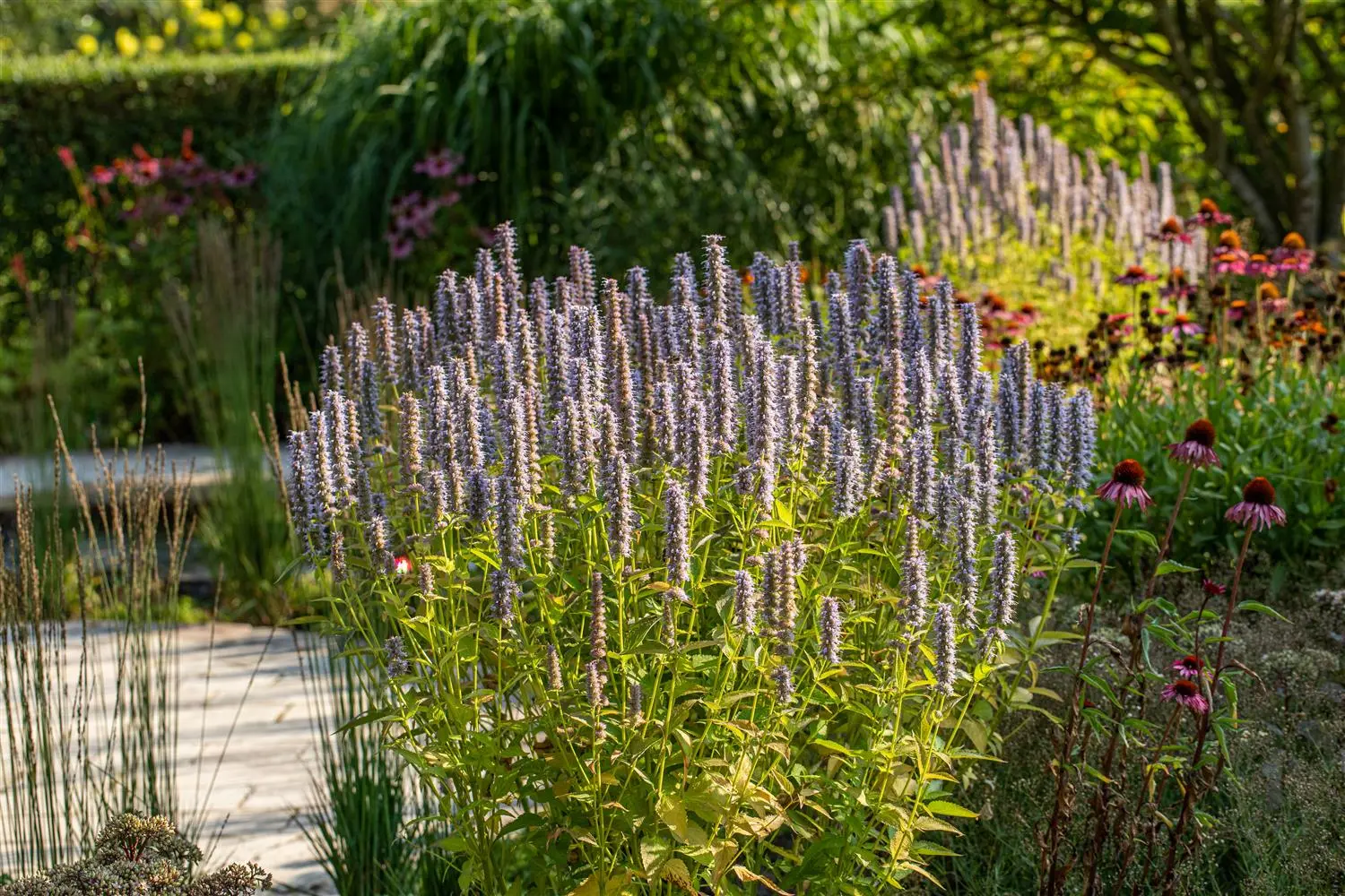Agastache rugosa 'Blue Fortune' forms lip-shaped, blue-violet flowers arranged in spikes from July. These exude a pleasant fragrance.