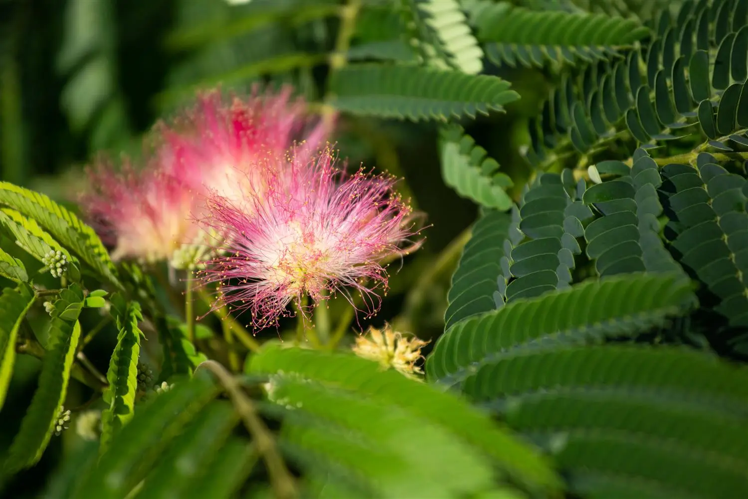 The Silk tree 'Ombrella' (Albizia julibrissin) is an umbrella-shaped small tree that produces pink-coloured flowers with a pleasant fragrance. They appear from July to August. The Silk tree 'Ombrella' also has pinnate, dark green leaves. Its bark is grey. In a sunny, sheltered location with well-drained soil, it usually reaches a height of around 12 metres and grows to a width of around 10 metres.