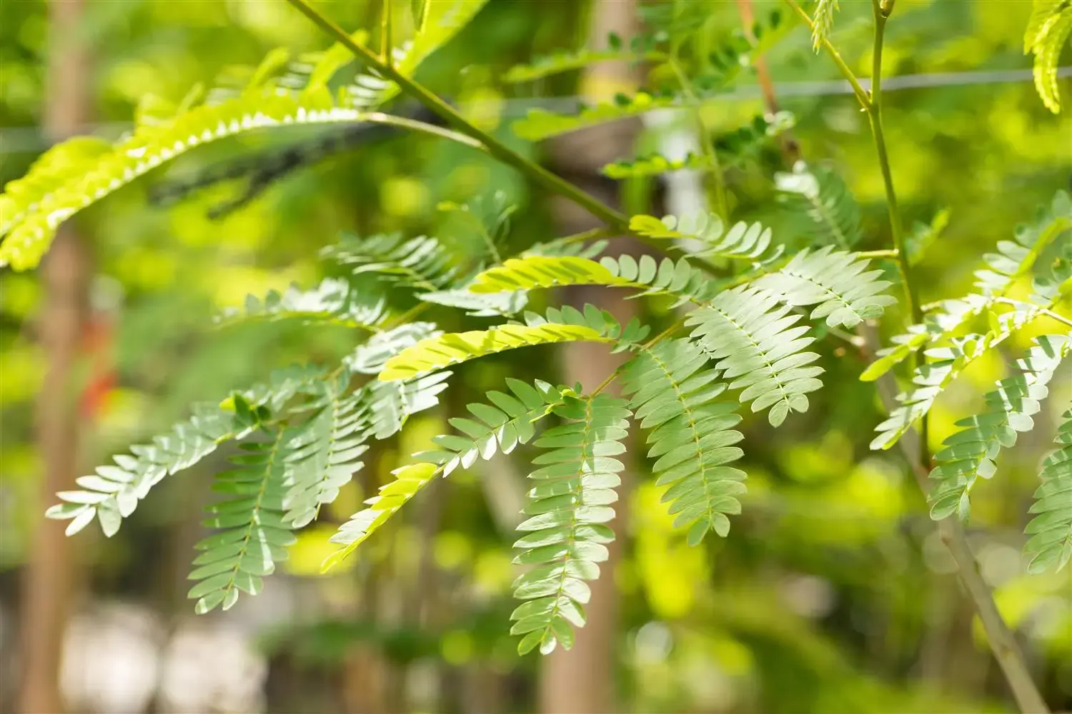 The deciduous leaves of the Silk tree 'Rouge de Tuilière' are medium green, pinnate. Silk tree 'Rouge de Tuilière' turns bright yellow in autumn.