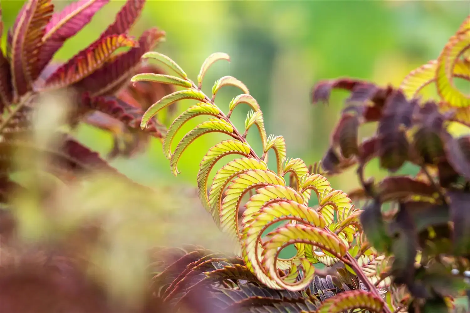 The Silk tree 'Summer Chocolate'(s) (Albizia julibrissin) is a rounded, upright, deciduous shrub with decorative, feathery, red-brown leaves. It also bears pink-coloured flowers from July to August. In a sunny to semi-shady location with well-drained, dry soil, it usually reaches a height of around 4 metres and is around 3 metres wide.
