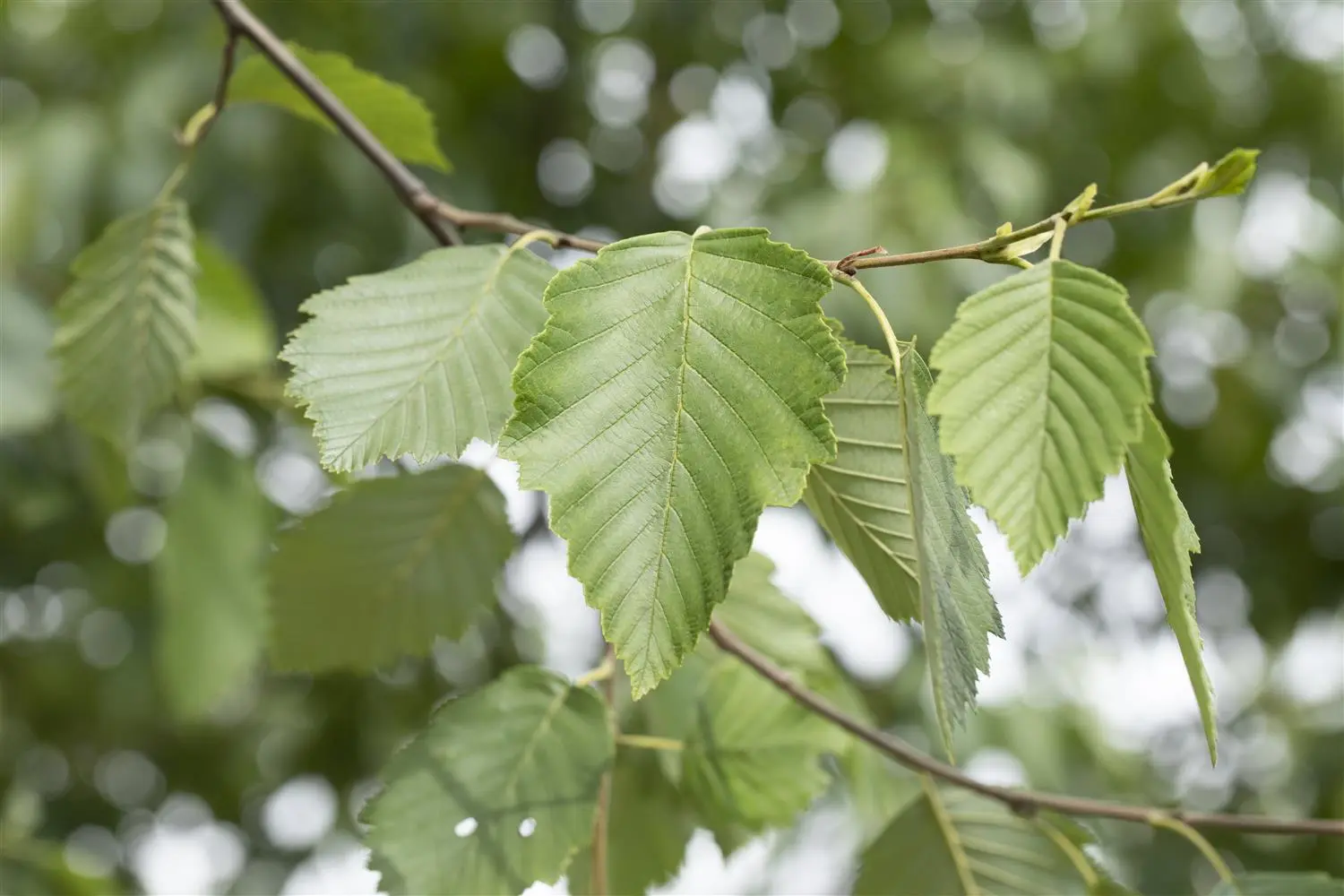 The deciduous leaves of the Grey alder are dark green, ovate, alternate.