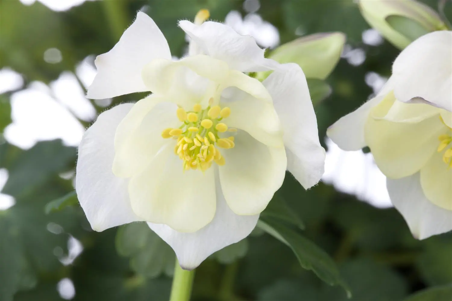 The Columbine (Aquilegia caerulea) is an upright perennial that produces bicoloured, bell-shaped flowers from May to June. Its pinnate, lobed leaves are dark green. In a sunny to semi-shady location with well-drained, humus-rich, loose, nutrient-rich soil, it usually reaches a height of approx. 80 cm and is approx. 30 cm wide. The Columbine is well tolerant of frost.