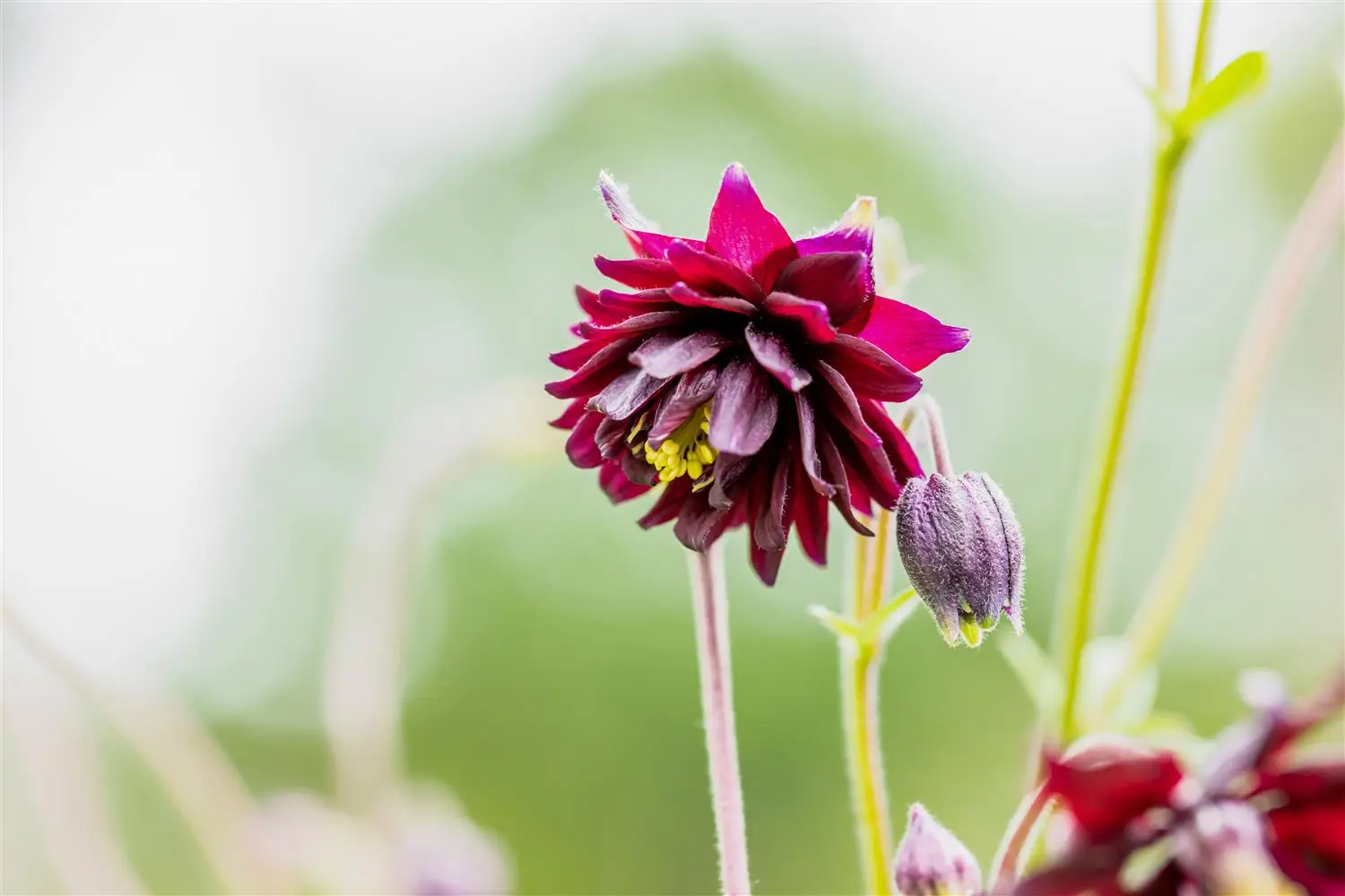 Aquilegia vulgaris 'Black Barlow' forms double, bell-shaped, black-red flowers from May.