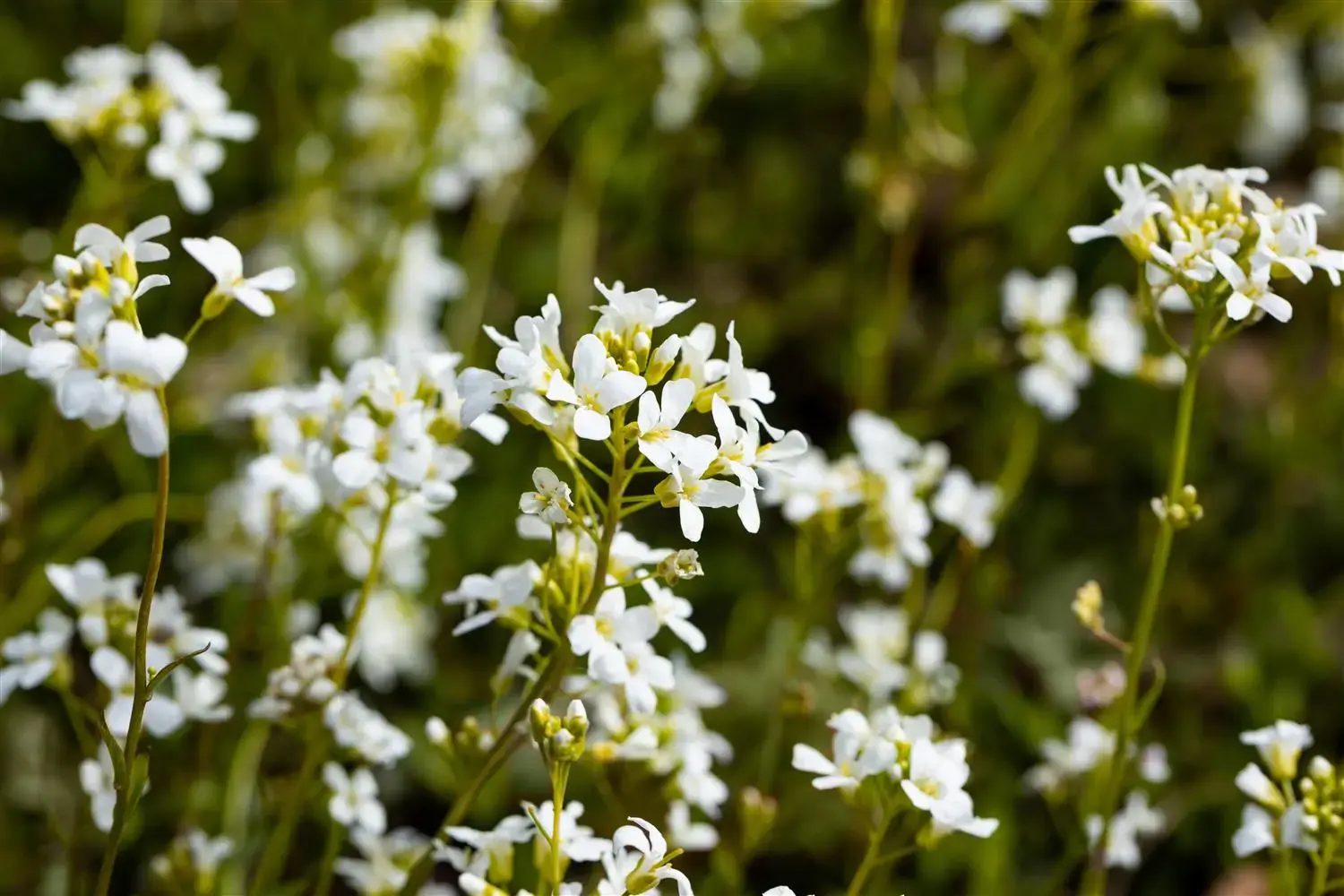 Arabis procurrens 'Glacier' forms wheel-shaped, white flowers arranged in clusters from April.