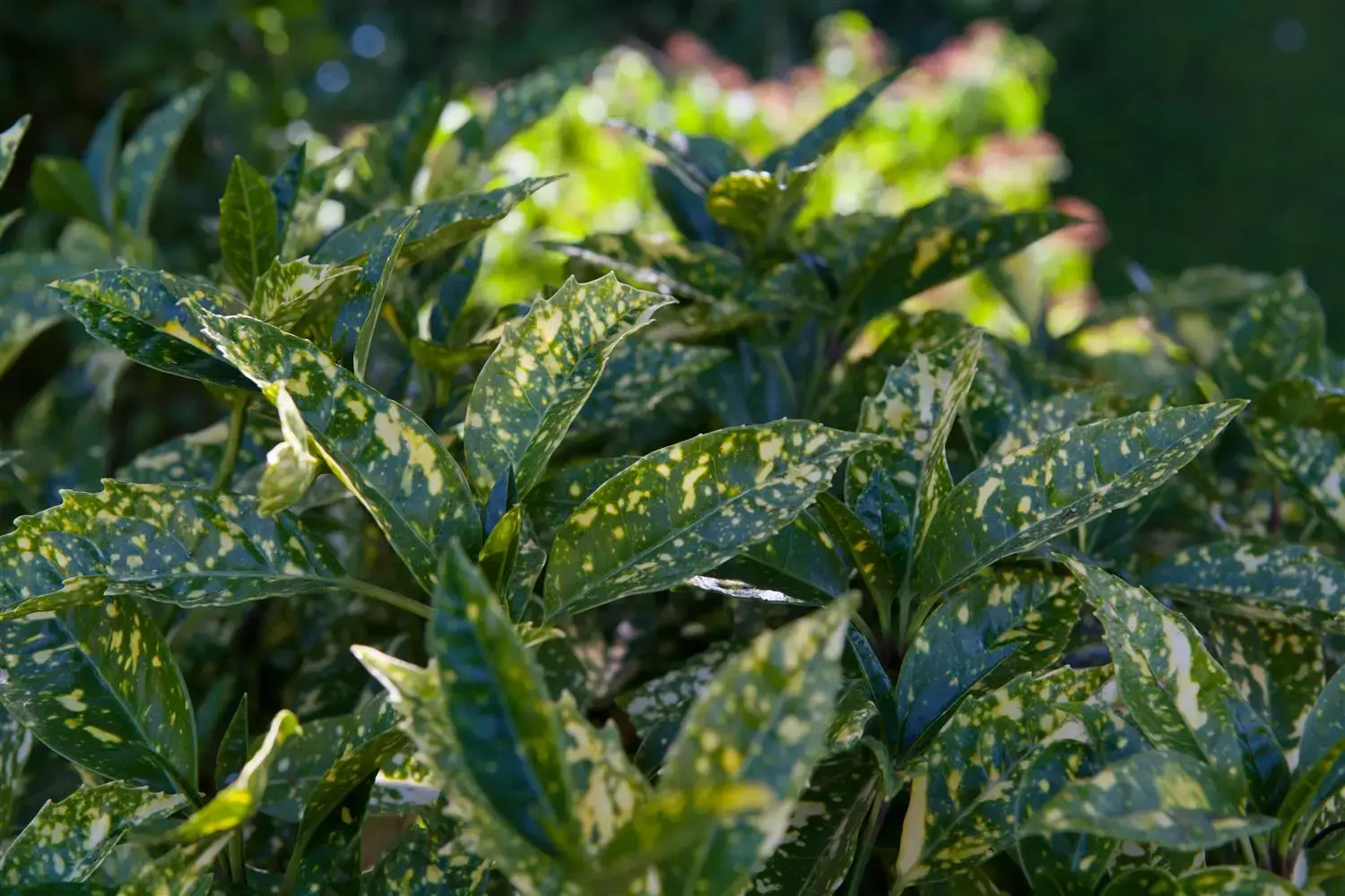 The evergreen leaves of the Spotted laurel 'Crotonifolia' are yellow-green, variegated, lanceolate.