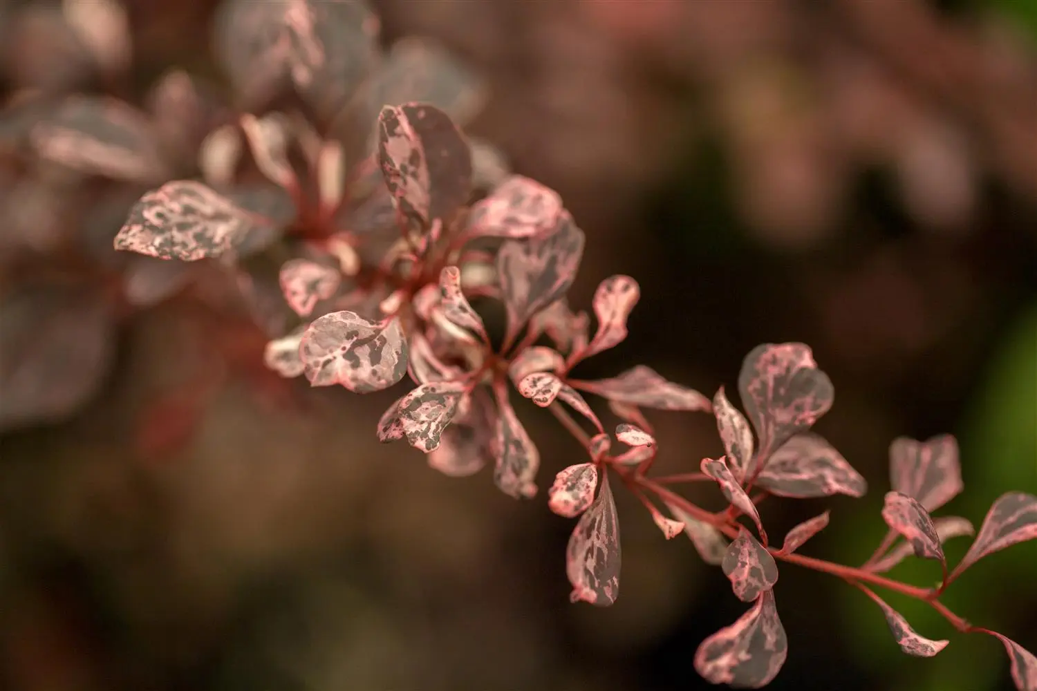 The Japanese barberry 'Harlequin' also has egg-shaped, pink-coloured, variegated leaves. In a sunny to semi-shady location with well-drained, humus-rich, acidic soil, it usually reaches a height of approx. 1 m and is approx. 1.2 m wide.