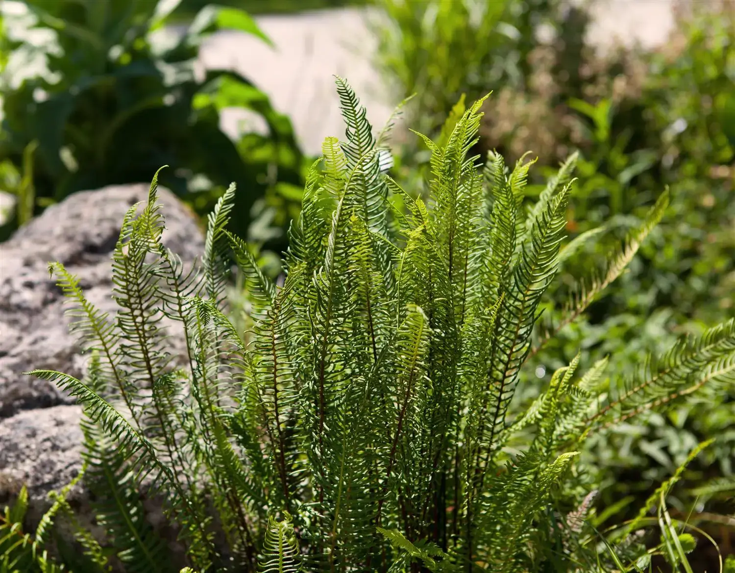 The Hard fern (Blechnum spicant) with its feathery, dark green leaf fronds is a decorative design element in the garden. It feels most at home in a semi-shady to shady location with well-drained, nutrient-rich, acidic soil. In favourable conditions, this hardy fern reaches a height of approx. 30 cm and grows up to 40 cm wide.