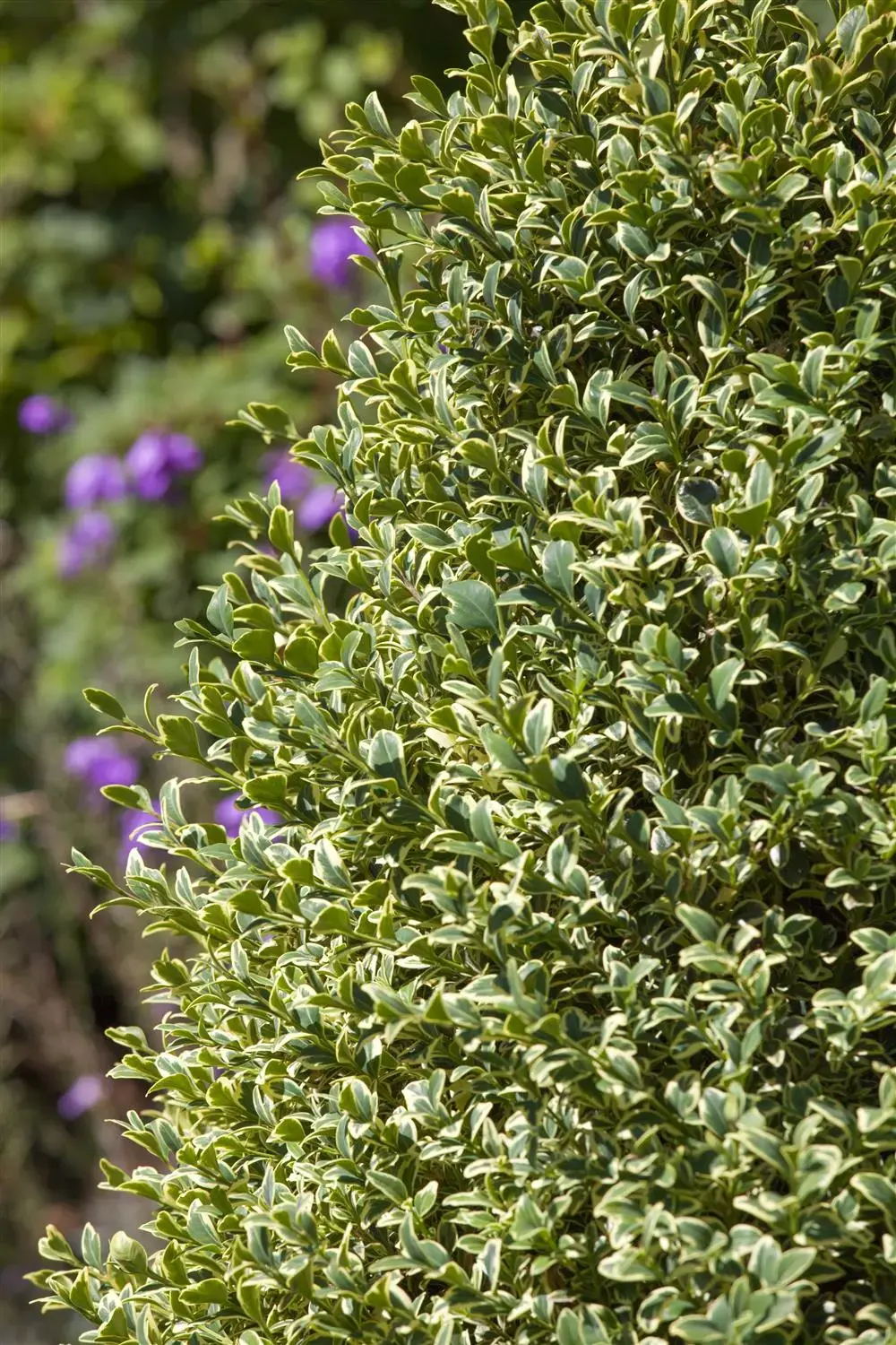 The Common box 'Elegantissima' (Buxus sempervirens) is an upright, dense, evergreen small shrub with decorative, roundish, white-coloured leaves. In a sunny to shady location with well-drained, humus-rich, calcareous, sandy soil, it usually reaches a height of approx. 1 m and grows to a width of approx. 80 cm.