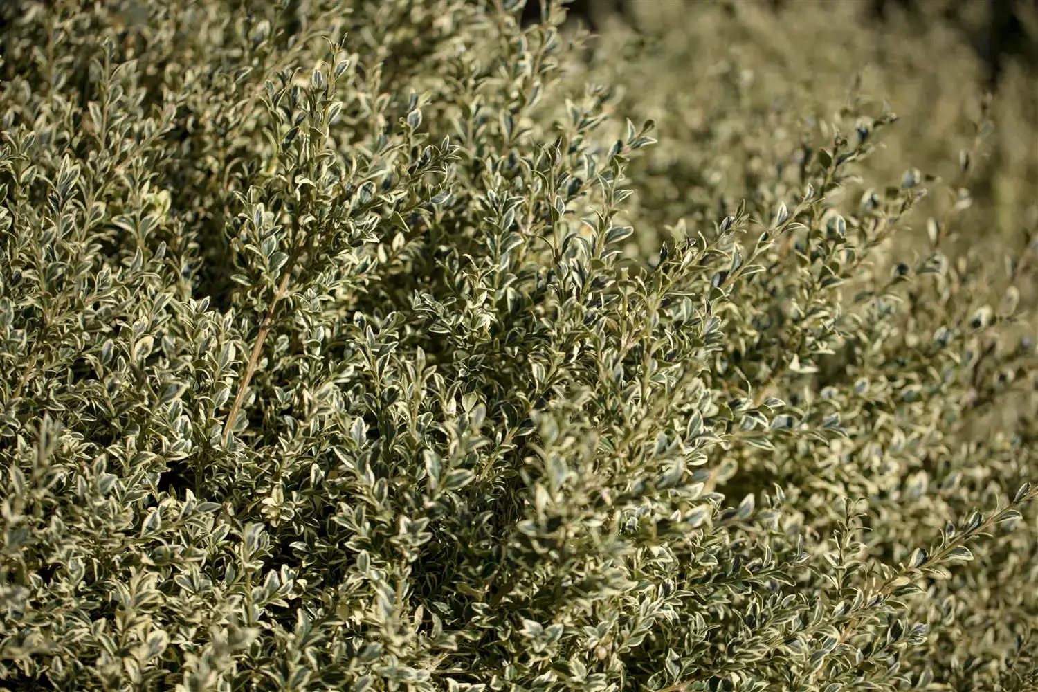 High leaf ornamental value. The evergreen leaves of the Common box 'Elegantissima's are white-coloured, roundish, with entire margins.