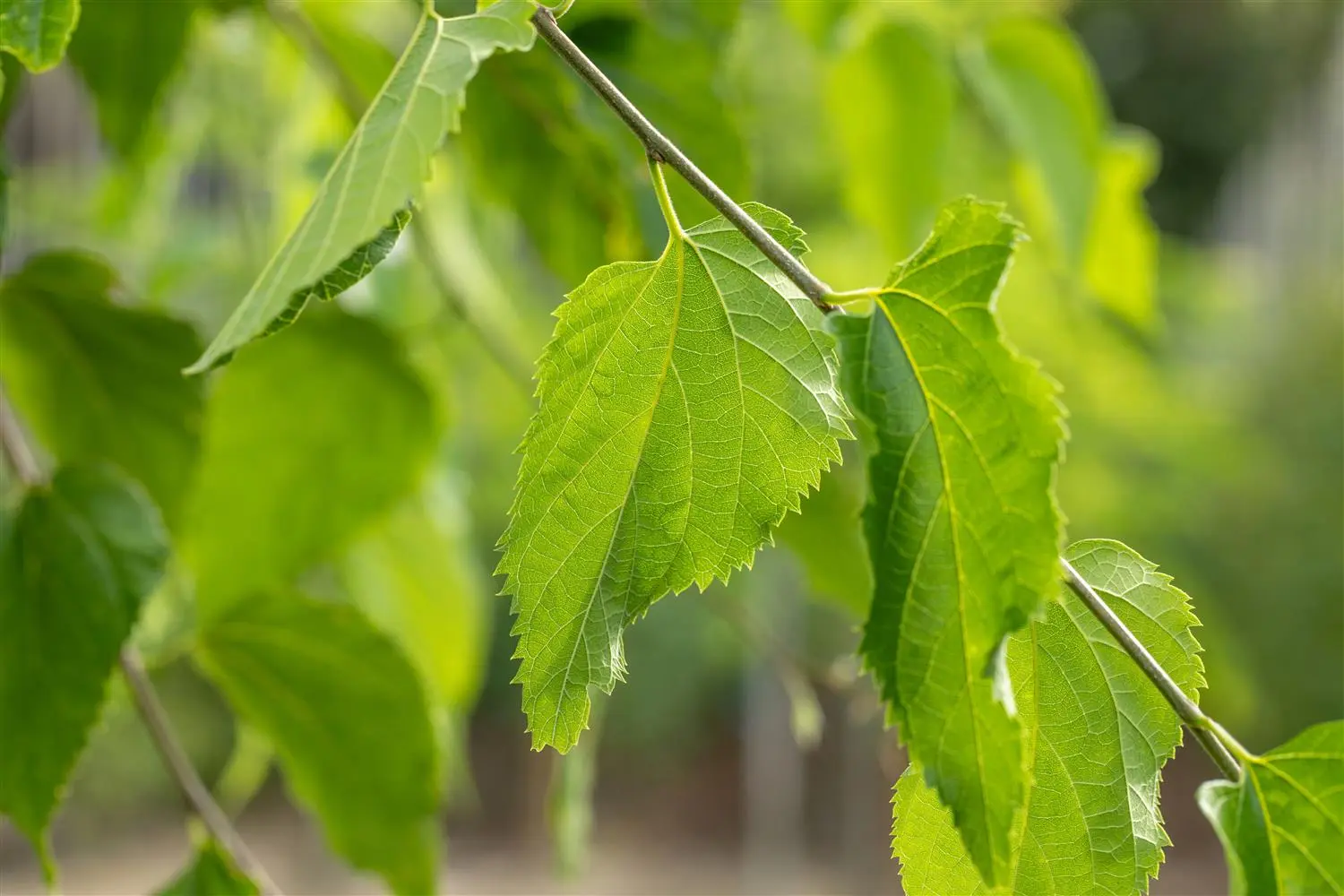 The Hackberry (Celtis occidentalis) is a broad, irregular tree that produces greenish-yellow flowers. These produce orange-red fruits. The Hackberry also has egg-shaped, dark green leaves. Its bark is grey and deeply fissured. In a sunny location with well-drained, nutrient-rich soil, it usually reaches a height of around 20 metres and grows to a width of around 18 metres.