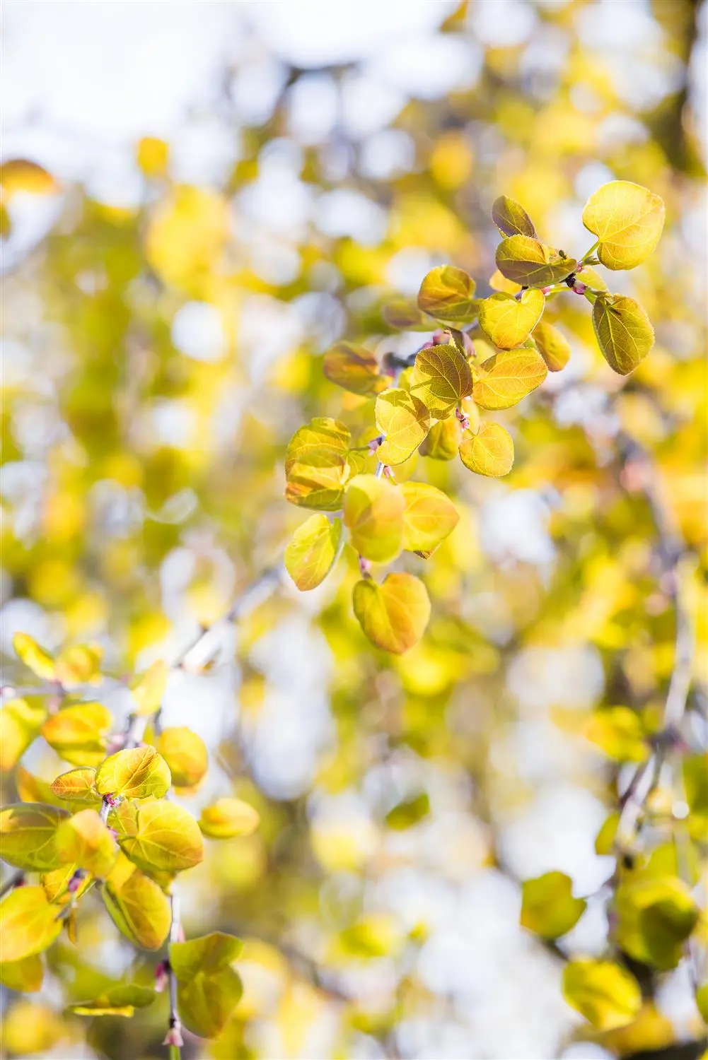 The deciduous leaves of the Katsura tree 'Pendulum's are green, roundish, matt. Copper-brown shoots. Katsura tree 'Pendulum' turns bright orange-yellow in autumn.
