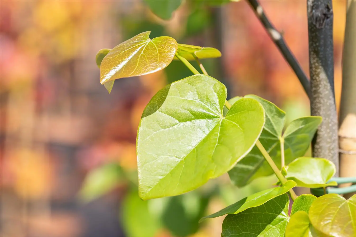The deciduous leaves of the Eastern redbud 'Pink Pom Poms's are light green, heart-shaped and alternate. They are about 8 - 14 cm in size.