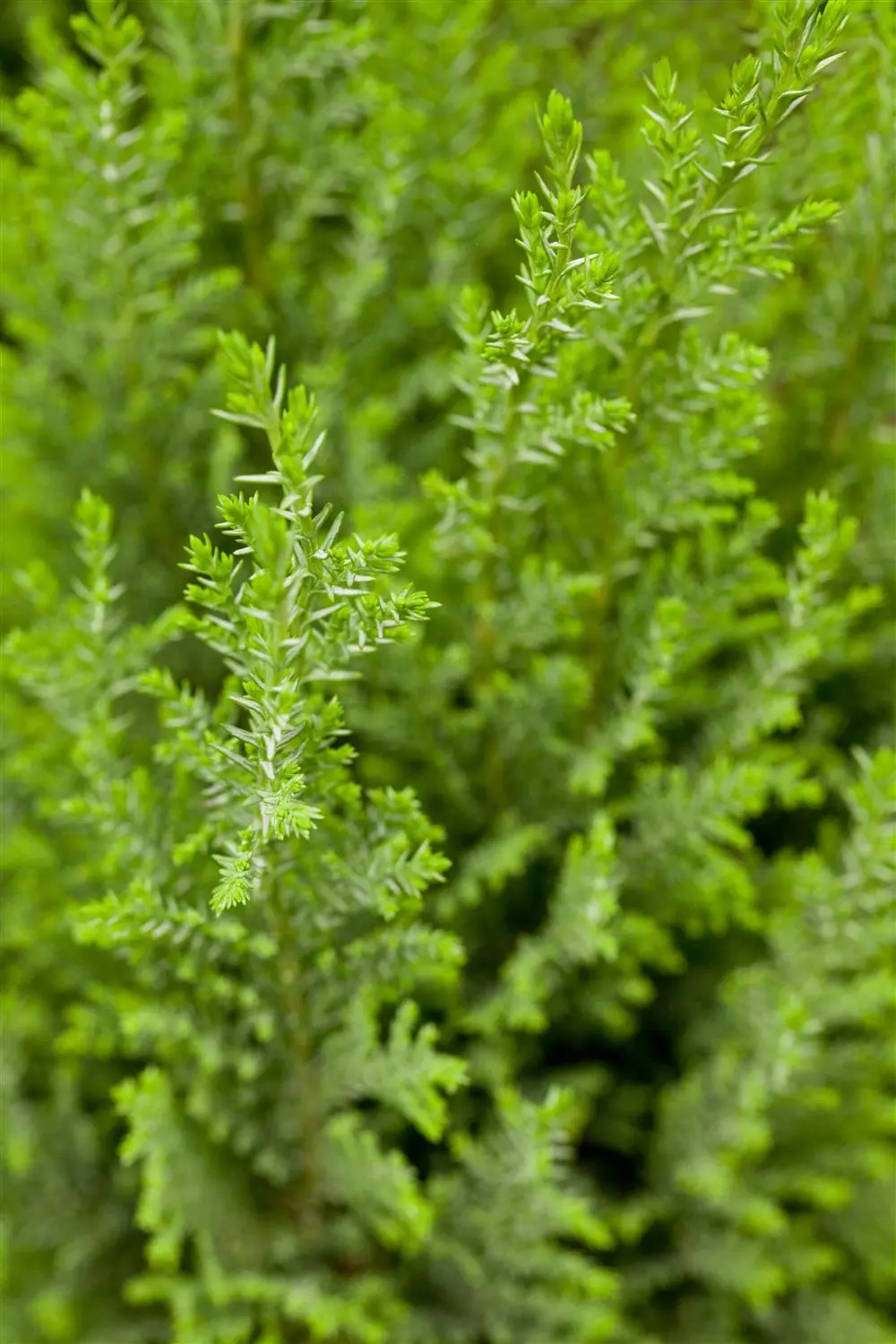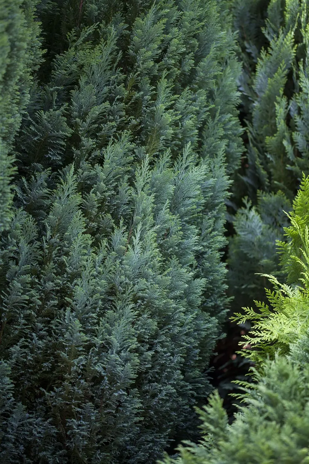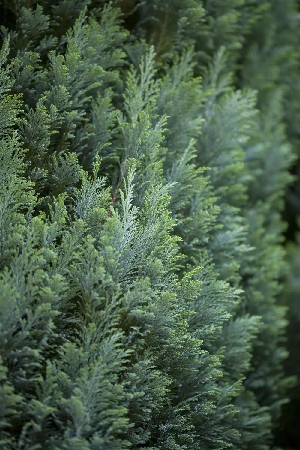 The Lawson cypress 'Ellwoodii' (Chamaecyparis lawsoniana) is a shrub or large shrub that grows cone-shaped and usually reaches a height of around 3 metres and a width of around 1.2 metres. Its scale-like leaves are blue-green in colour. This shrub is well tolerant of frost and prefers well-drained, loose soil in a sunny to semi-shady position.