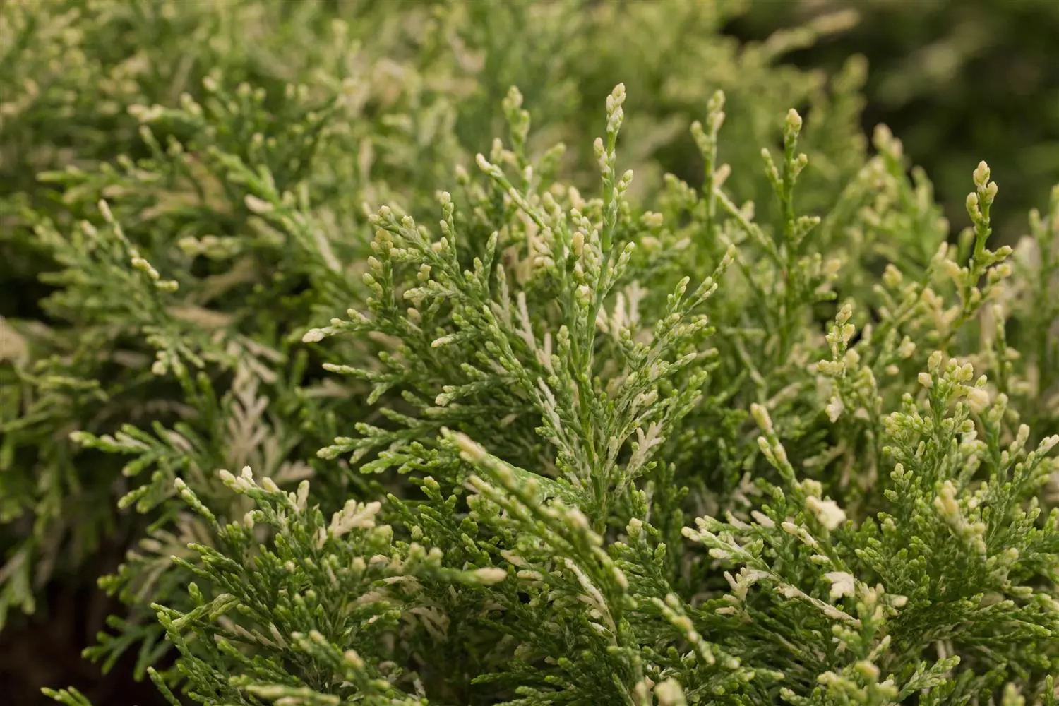 The Lawson cypress 'Pearly Swirls'® is evergreen. Its needles are green-white, scale-like. Creamy white shoots.