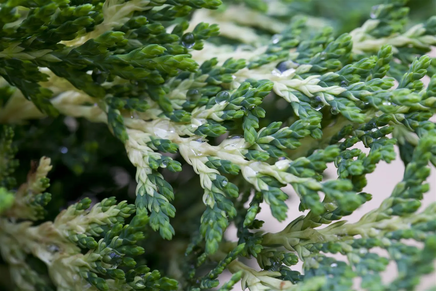 The Lawson cypress 'Sunkist' is evergreen. Its needles are dark green, yellow-green, opposite, scaly.