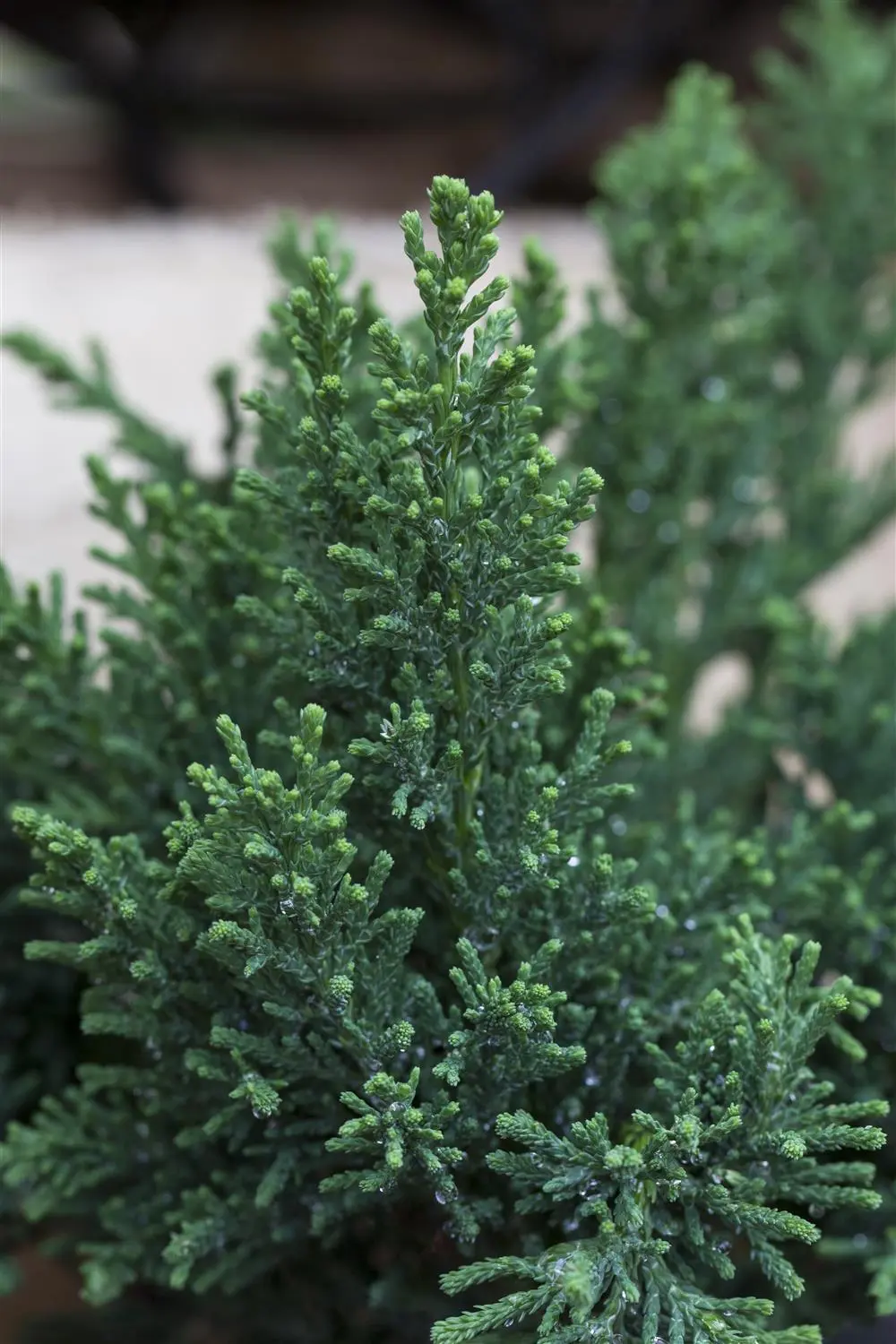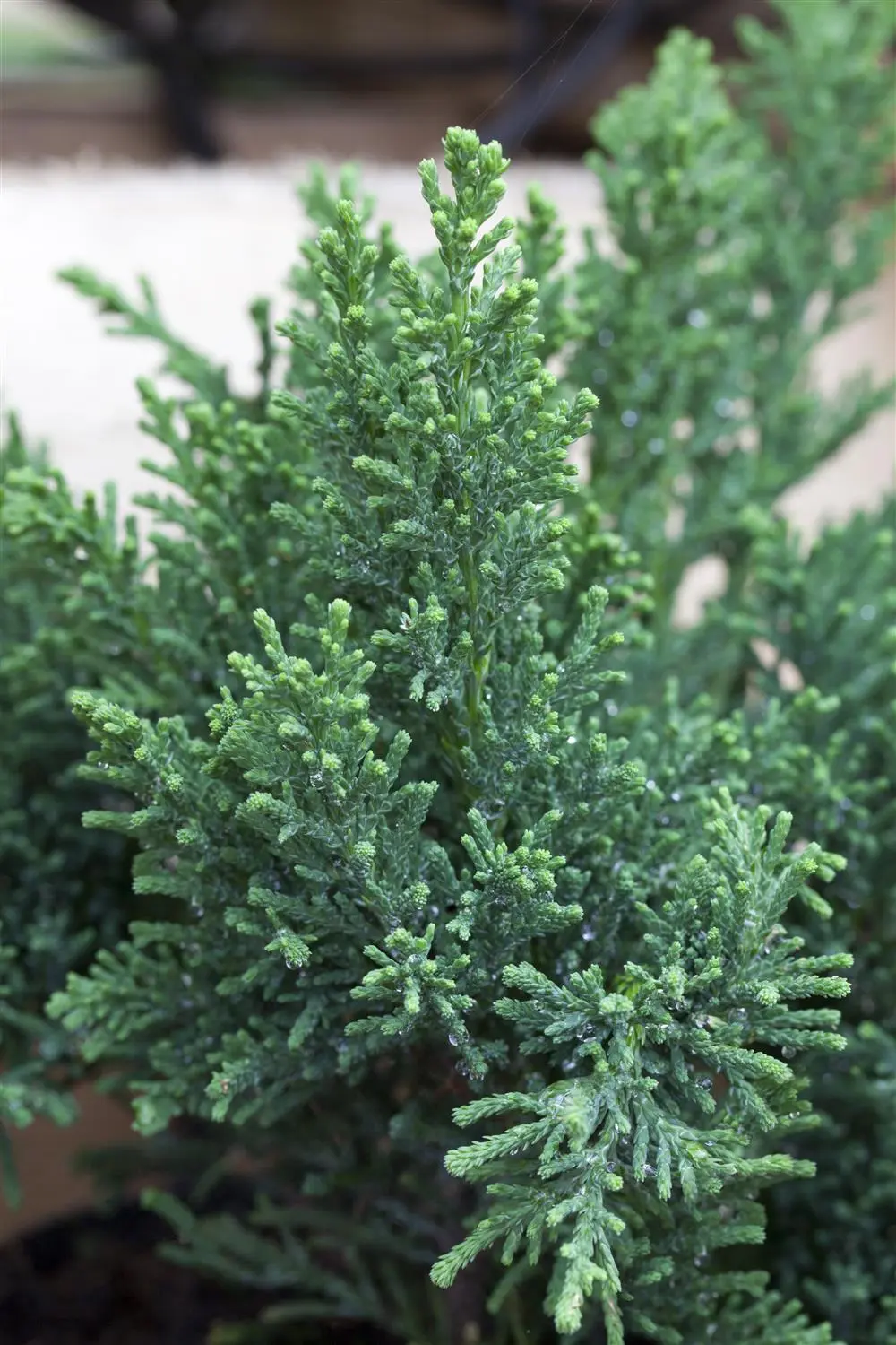 The Hinoki cypress 'Drath' (Chamaecyparis obtusa) is a shrub that grows in a cone shape and usually reaches a height of around 5 metres and a width of around 2.5 metres. Its scale-like leaves are blue-green in colour. This shrub is well tolerant of frost and prefers well-drained, humus-rich soil in a sunny to semi-shady position.