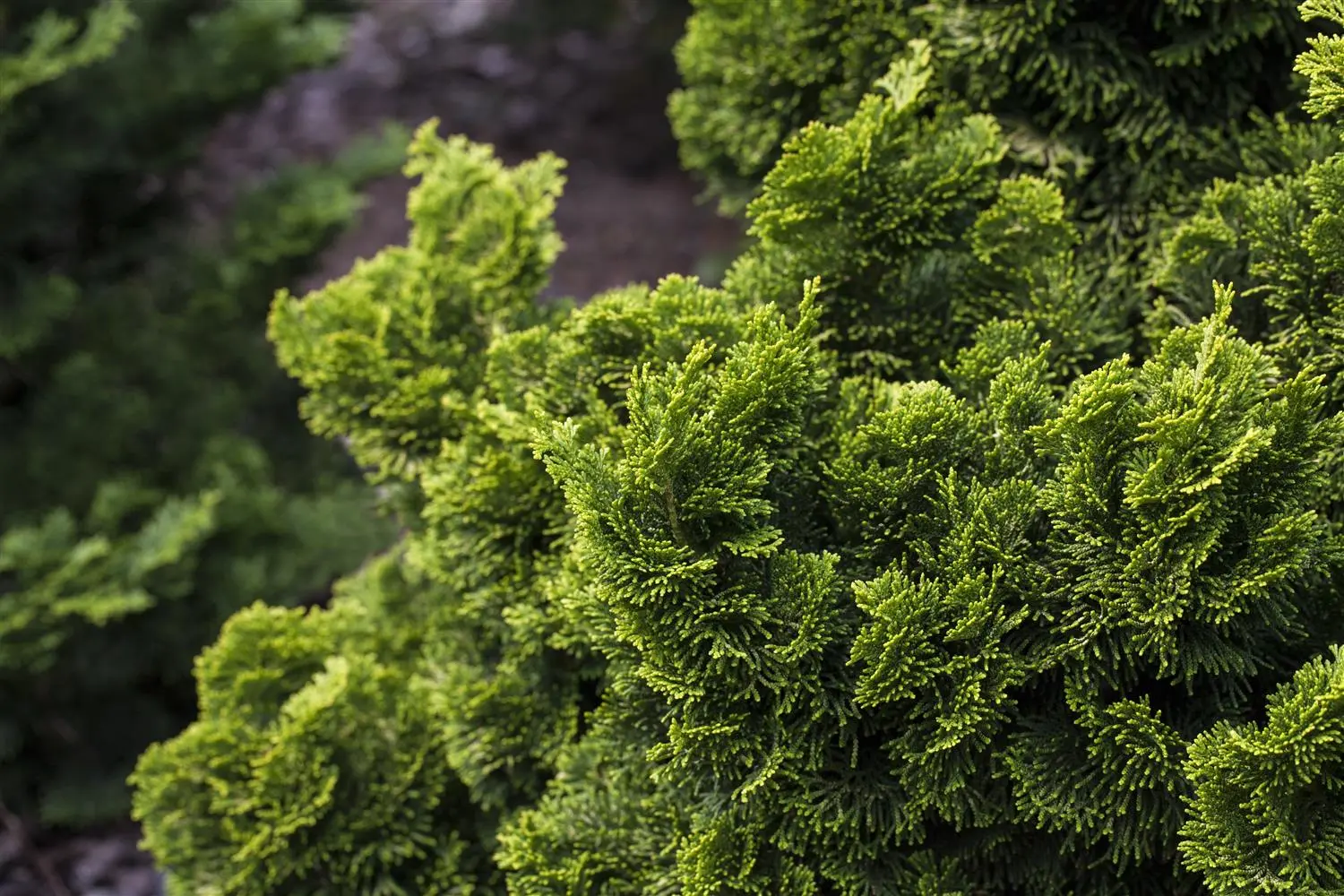The Hinoki cypress 'Nana Aurea' (Chamaecyparis obtusa) is a shrub that grows round and usually reaches a height of around 2.5 metres and a width of around 2.5 metres. Its scale-like, glossy leaves are greenish-yellow in colour. This shrub is well tolerant of frost and prefers well-drained, humus-rich soil in a sunny to semi-shady position.
