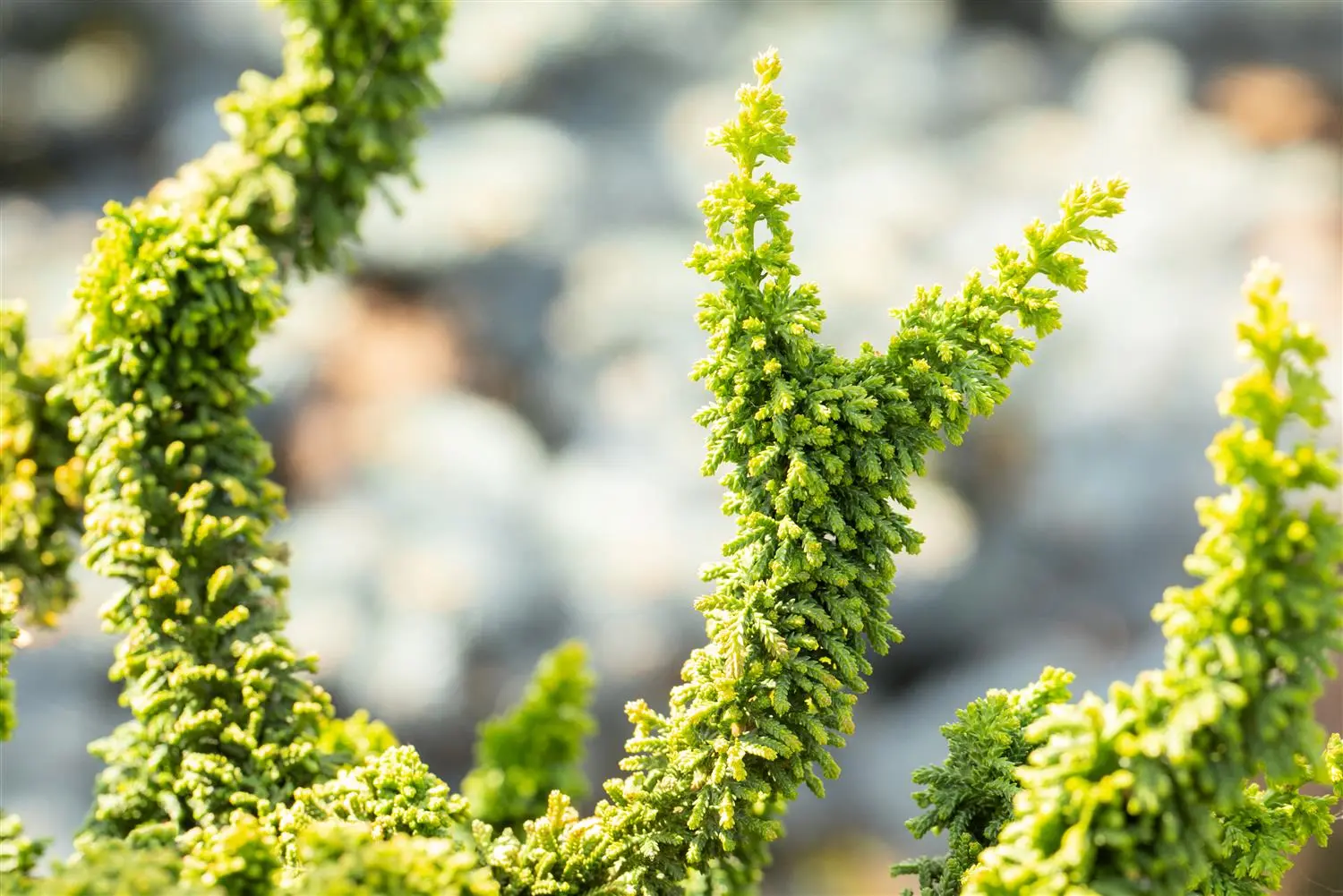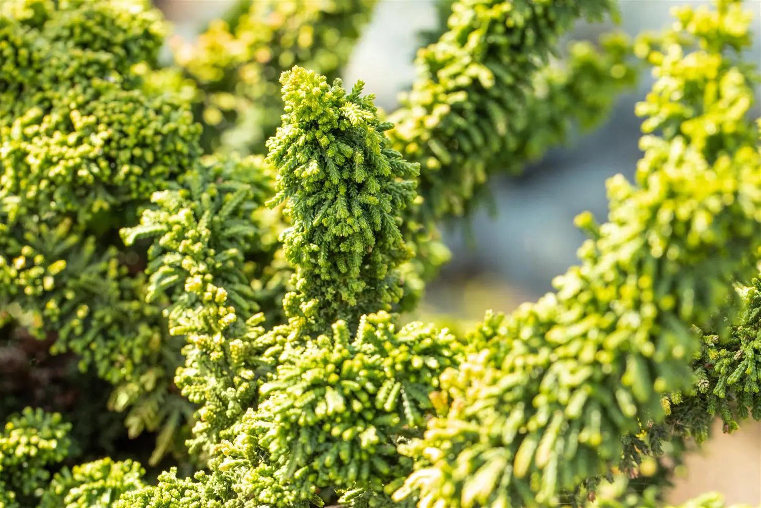The Hinoki cypress 'Teddy Bear' (Chamaecyparis obtusa) is a shrub that grows round, compact, dwarf and usually reaches a height of approx. 40 cm and a width of approx. 40 cm. Its scaly, glossy leaves have a medium green colour. This shrub is well tolerant of frost and prefers well-drained, humus-rich soil in a sunny to semi-shady position.