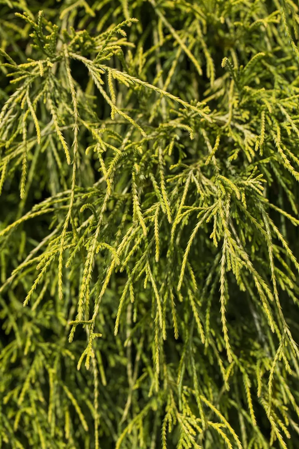 The Sawara cypress 'Filifera Nana' (Chamaecyparis pisifera) is a small shrub that grows flat and spherical and usually reaches a height of around 1.2 metres and a width of around 1.5 metres. Its needle-shaped leaves are yellow-green in colour. This shrub is well tolerant of frost and prefers loose, nutrient-rich soil in a sunny to semi-shady position.
