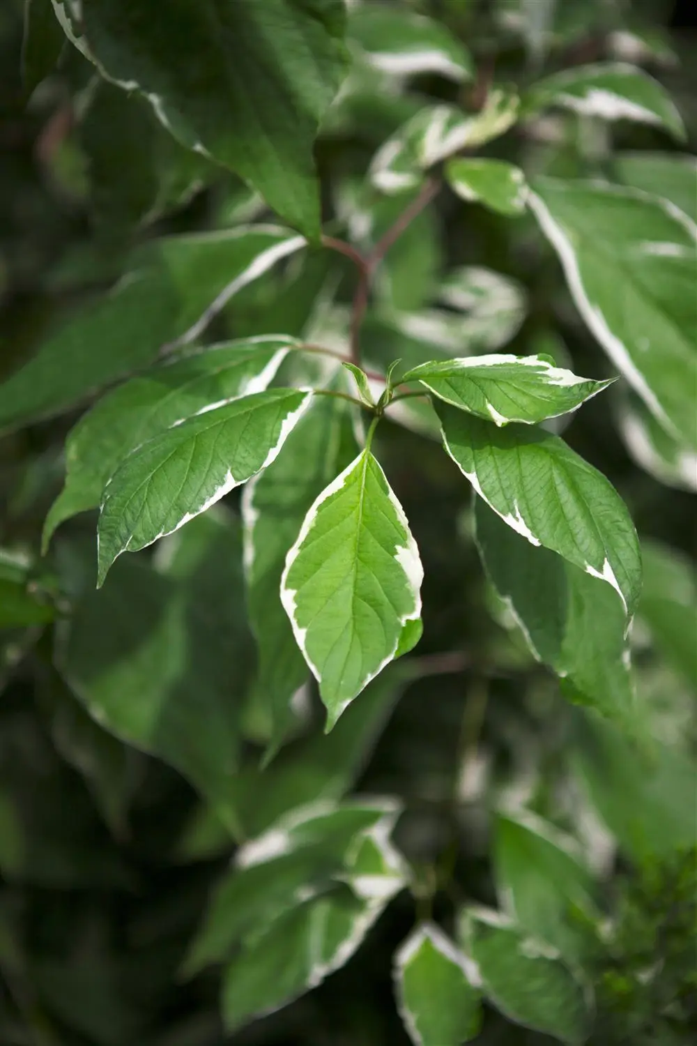 High leaf ornamental value. The deciduous leaves of the White dogwood 'Elegantissima's are dark green, ovate, opposite, with entire margins and a white edge. They are around 4 - 8 cm in size. White dogwood 'Elegantissima' turns bright carmine red in autumn.
