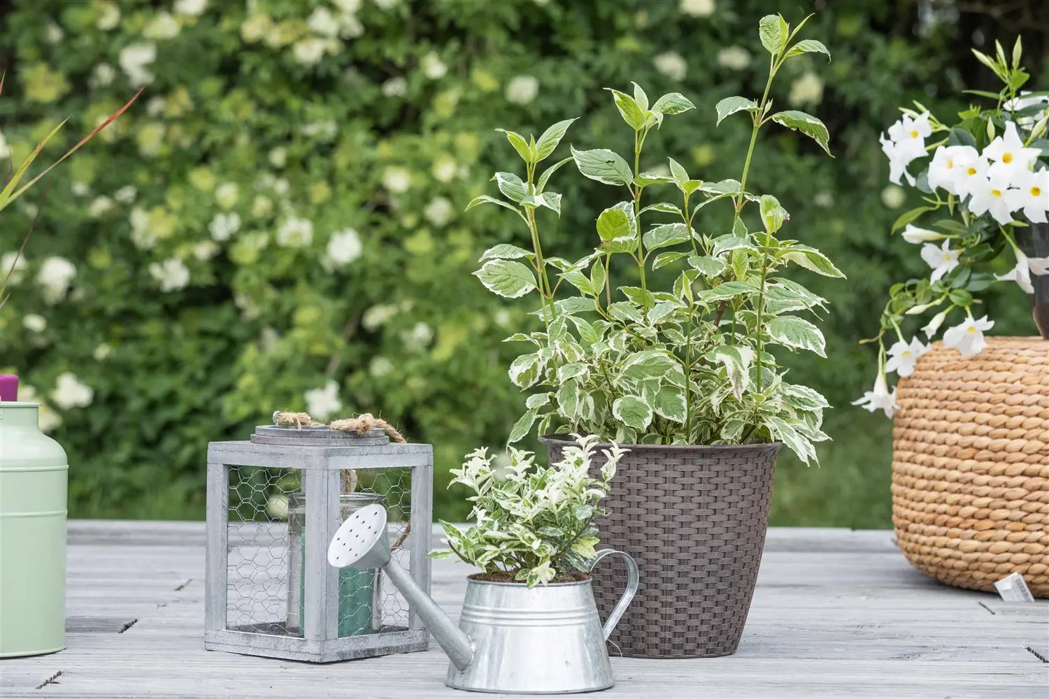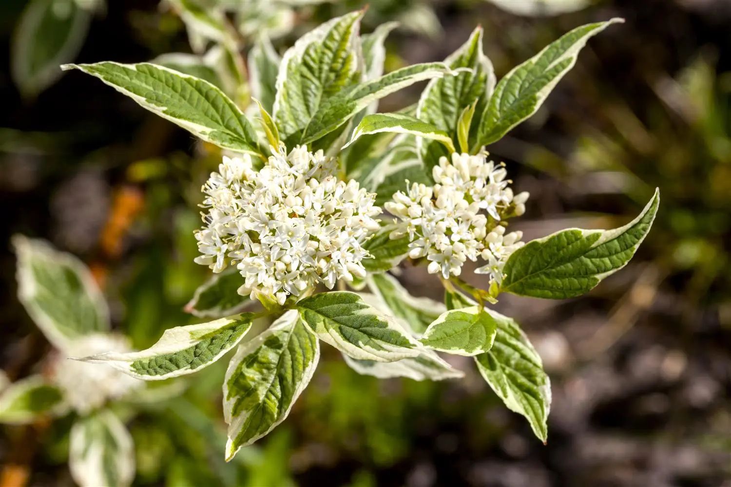 The White dogwood 'Sibirica Variegata' (Cornus alba) is an upright, compact shrub with decorative, light blue, round fruits. It produces white flowers arranged in umbels from May to June. The White dogwood 'Sibirica Variegata' also has egg-shaped, dark green leaves with a white-pink edge. In a sunny to semi-shady location with moist to wet soil, it usually reaches a height of approx. 3 metres and grows to a width of approx. 3 metres.