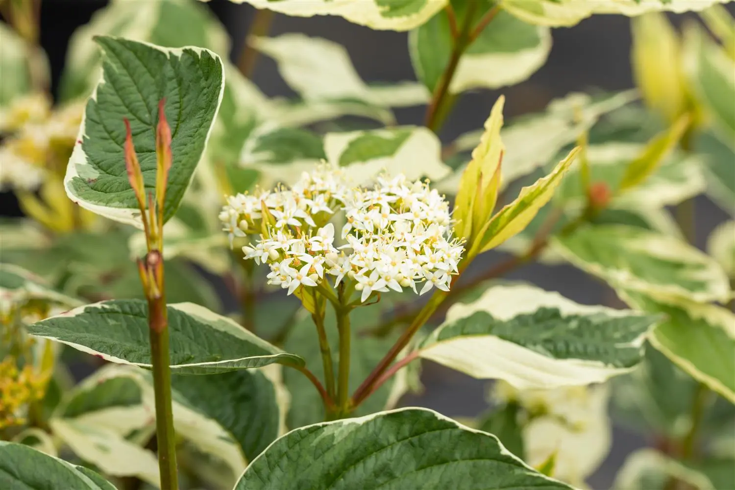 White dogwood 'Sibirica Variegata' is an upright and compact growing shrub. It usually reaches a height of 1.5 - 3 m and is approx. 1.5 - 3 m wide. Rapidly growing. Usually grows 30 - 40 cm per year.