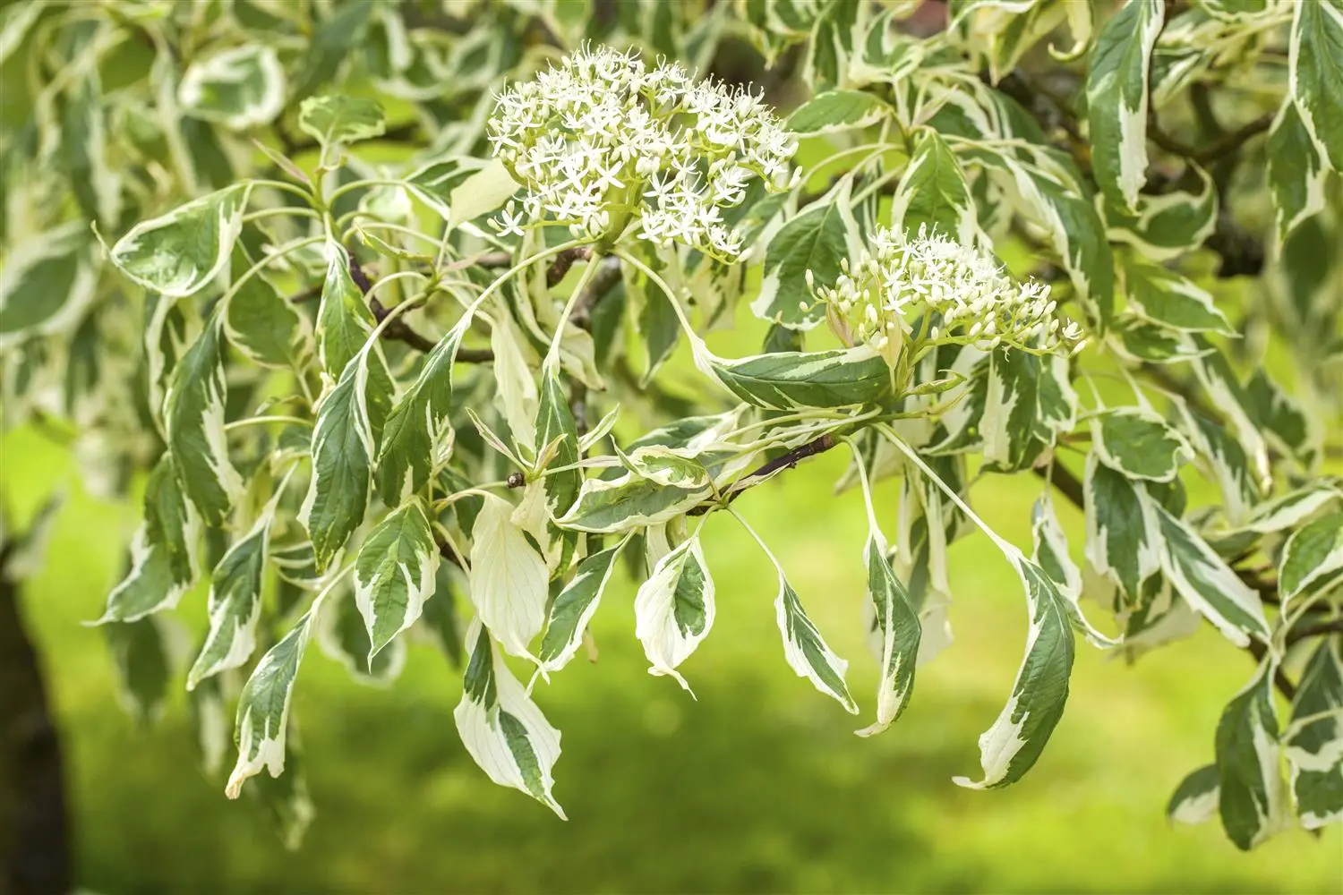 The Giant dogwood 'Variegata' (Cornus controversa) is a large conical shrub with decorative, black-blue fruits. It produces creamy white flowers arranged in umbrella clusters from May to July. The Giant dogwood 'Variegata' also has egg-shaped, dark green leaves with a white edge. The green-yellow shoots are also an interesting sight. In a sunny to semi-shady location with well-drained, nutrient-rich soil, it usually reaches a height of around 6 metres and grows to around 4 metres wide.