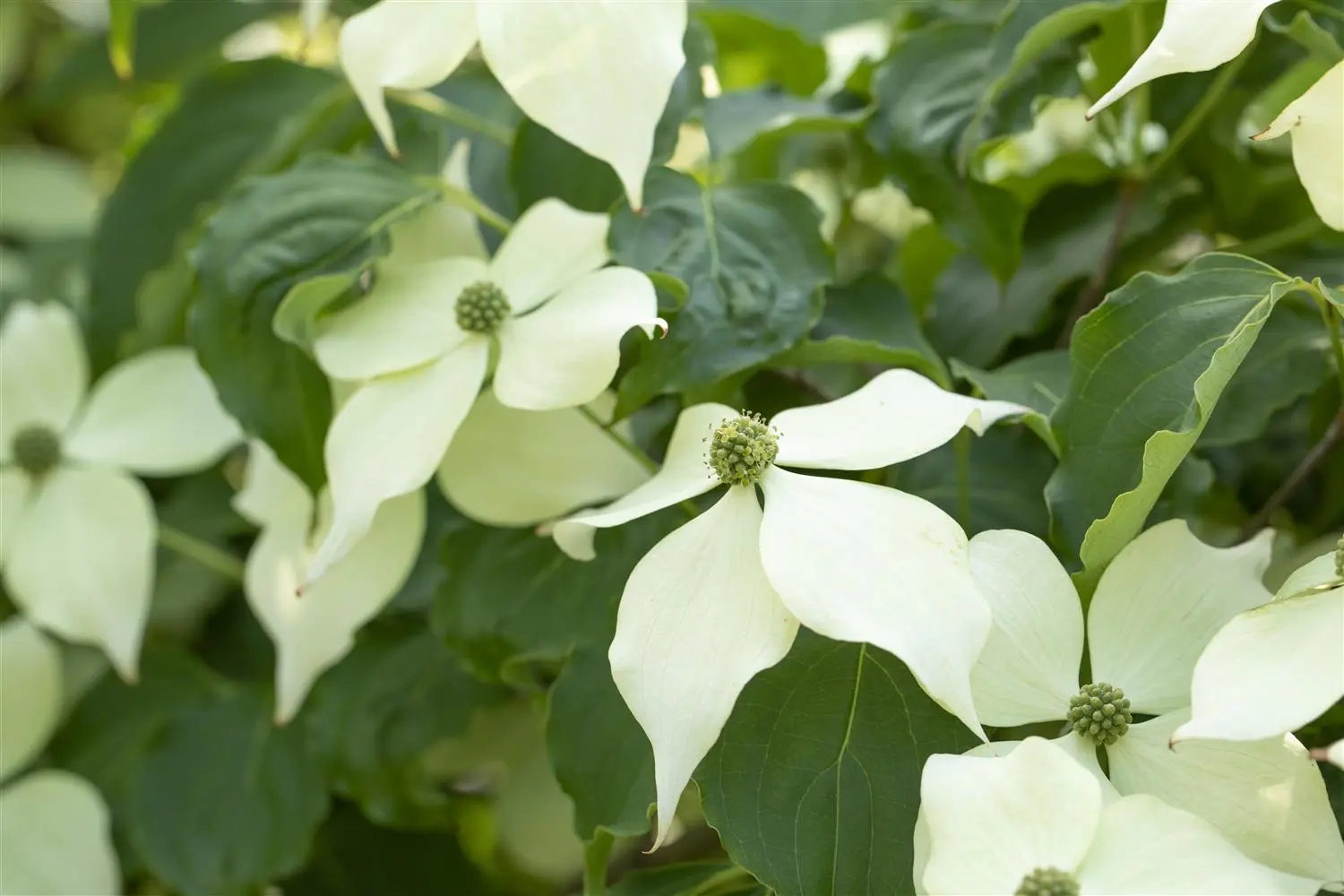The Kousa 'Venus'® (Cornus kousa) is an upright, spreading large shrub that produces white flowers. They appear from May to June. The Kousa 'Venus'® also has egg-shaped, medium-green leaves. In a sunny to semi-shady location with well-drained, humus-rich, lime-free, sandy soil, it usually reaches a height of around 6 metres and grows to a width of around 3 metres.