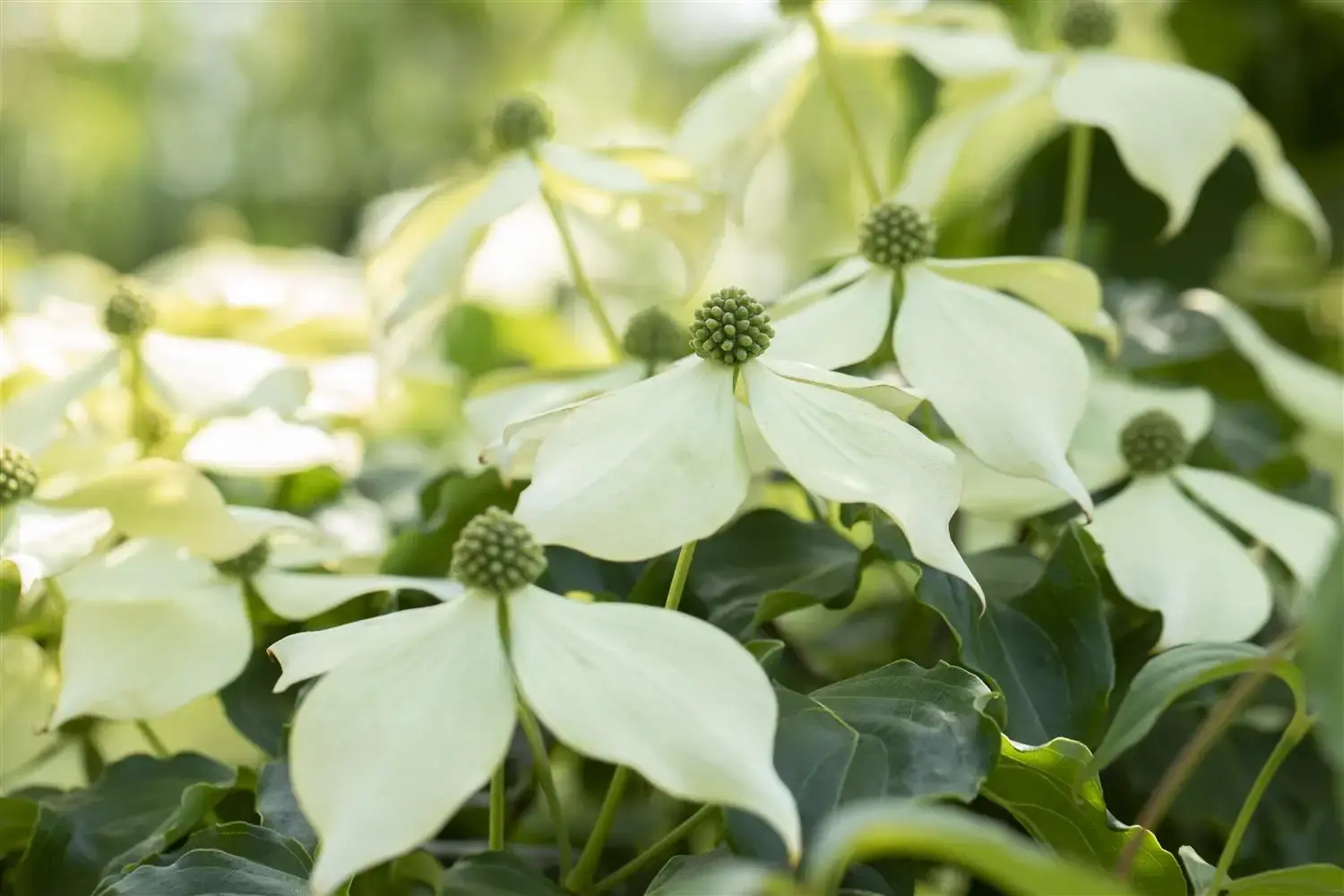 The Kousa 'Venus'® (Cornus kousa) is an upright, spreading large shrub that produces white flowers. They appear from May to June. The Kousa 'Venus'® also has egg-shaped, medium-green leaves. In a sunny to semi-shady location with well-drained, humus-rich, lime-free, sandy soil, it usually reaches a height of around 6 metres and grows to a width of around 3 metres.