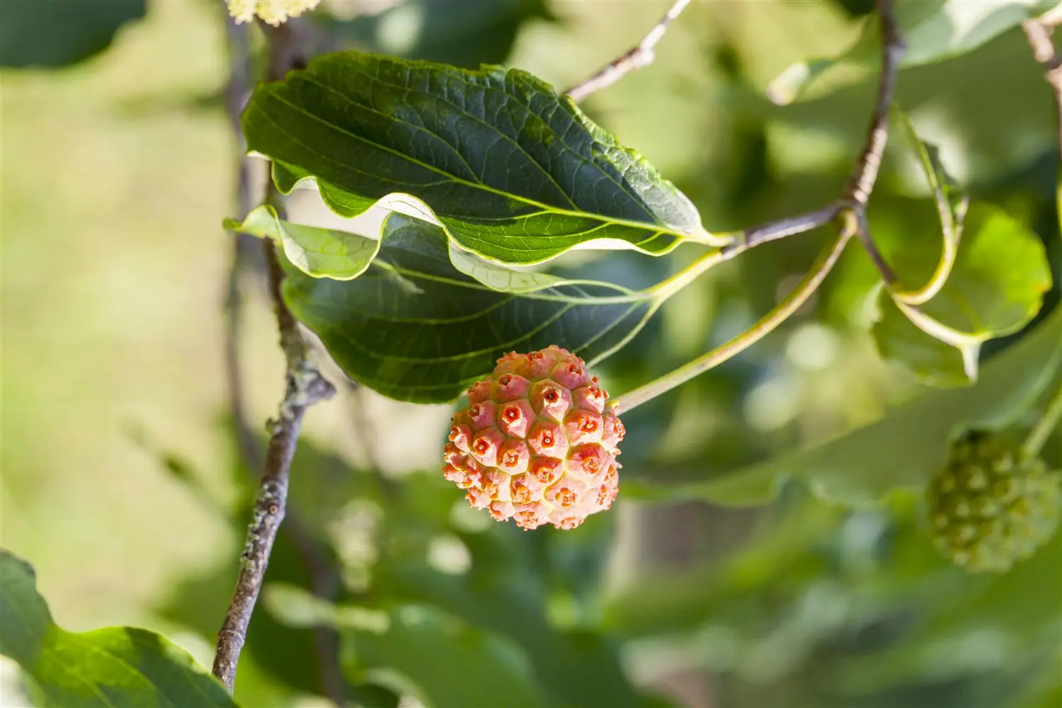 The pink-red, round berries of Cornus kousa 'White Fountain' are particularly decorative. These appear from September.