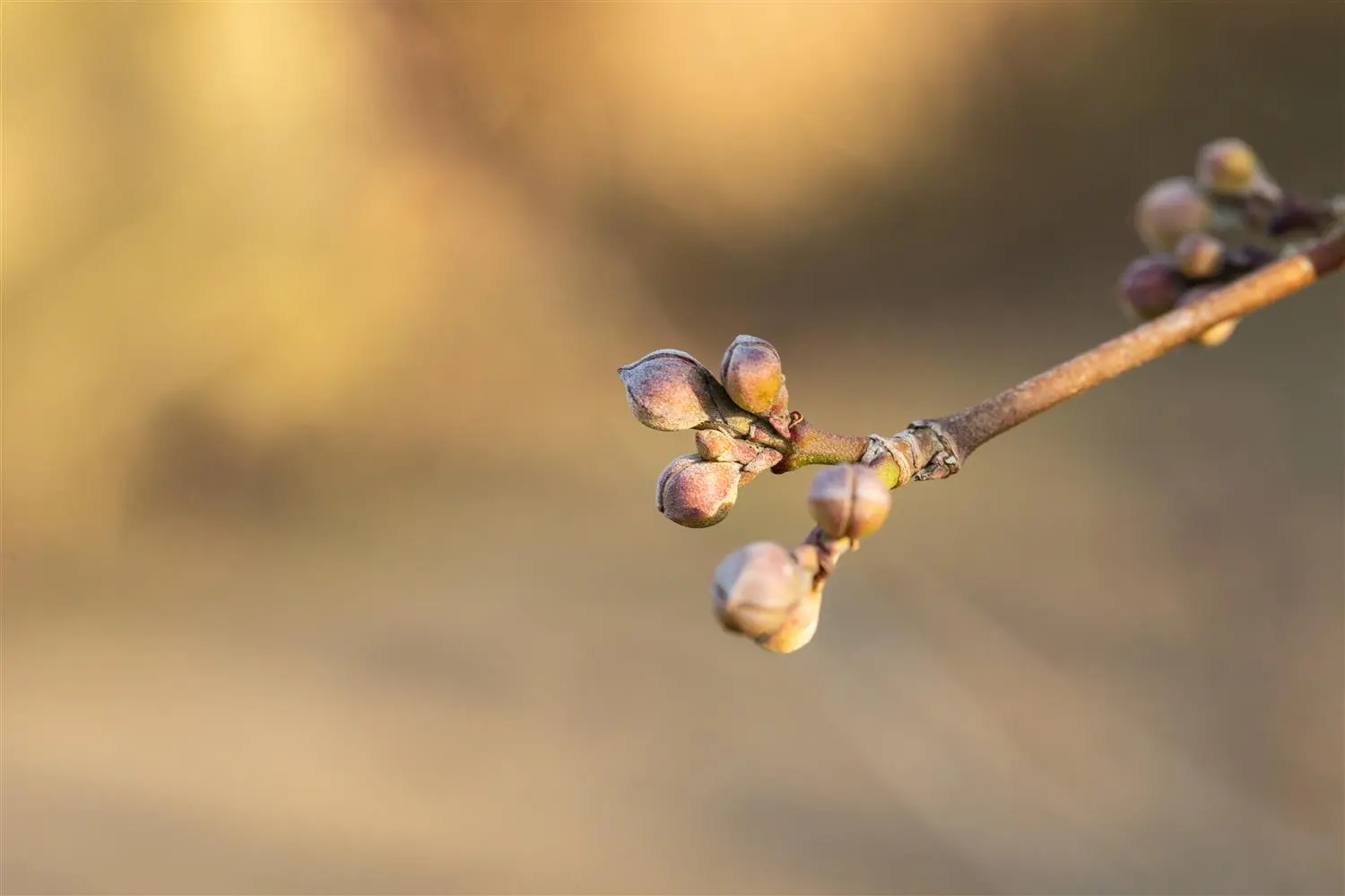 The golden yellow flowers of Cornelian cherry 'Golden Glory' appear in umbels from February to March. They are slightly fragrant.