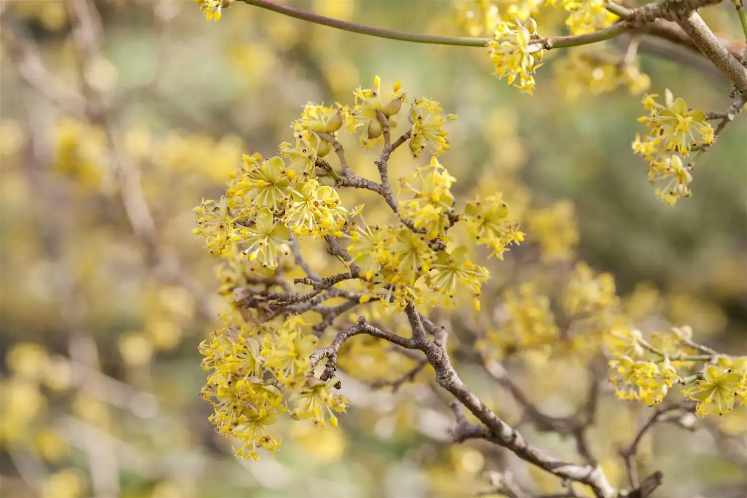 The Japanese cornelian cherry (Cornus officinalis) is a sprawling, multi-stemmed large shrub with decorative, scarlet-red, oval fruits. These exude a pleasant fragrance. It produces yellow flowers from February to March. The Japanese cornelian cherry also has shiny, egg-shaped, dark green leaves. In a sunny to semi-shady location with well-drained, humus-rich, calcareous soil, it usually reaches a height of around 7 metres and grows to a width of around 5 metres.