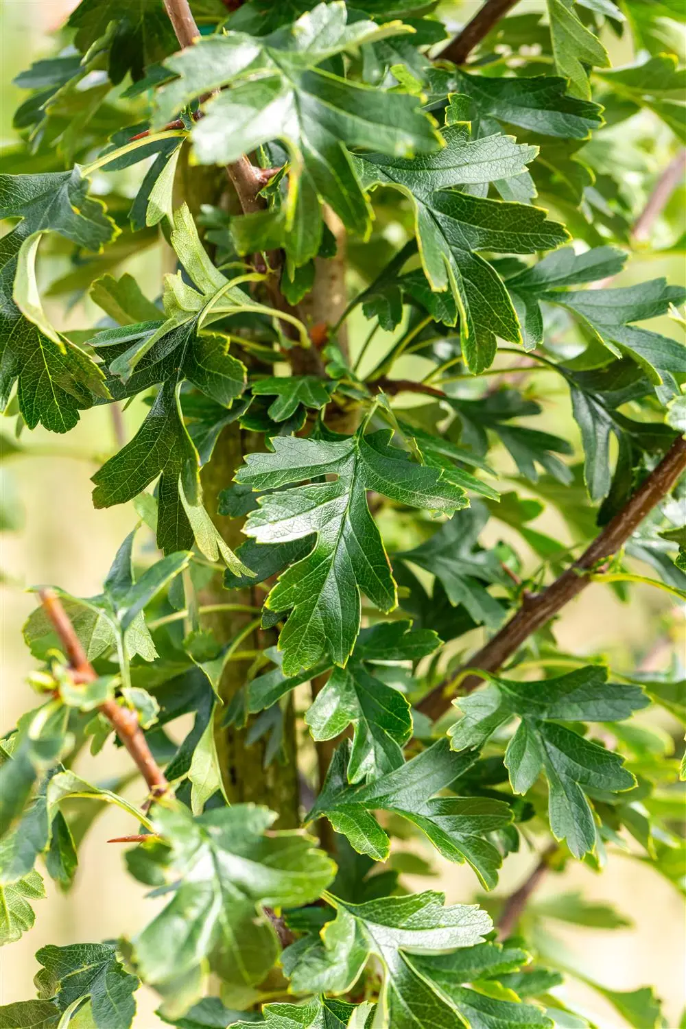 The shoots of Crataegus monogyna 'Stricta' are spiny, olive green.