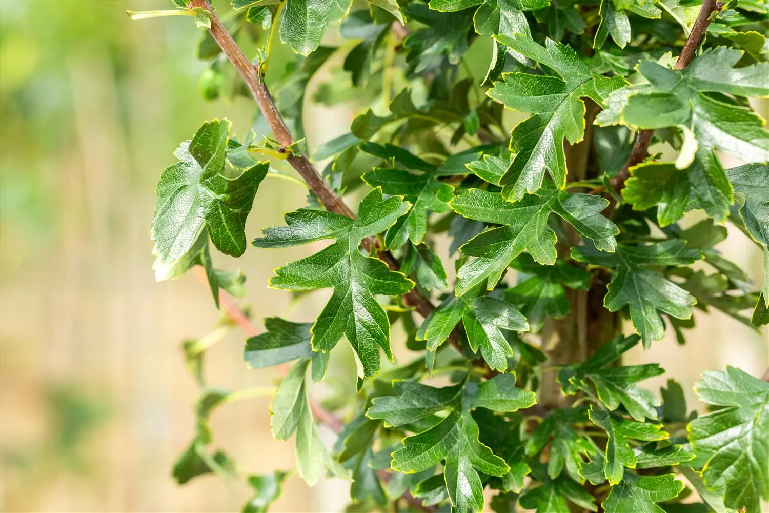 The deciduous leaves of the Common hawthorn 'Stricta' are dark green, cut, alternate. Common hawthorn 'Stricta' is bright orange-yellow in autumn.