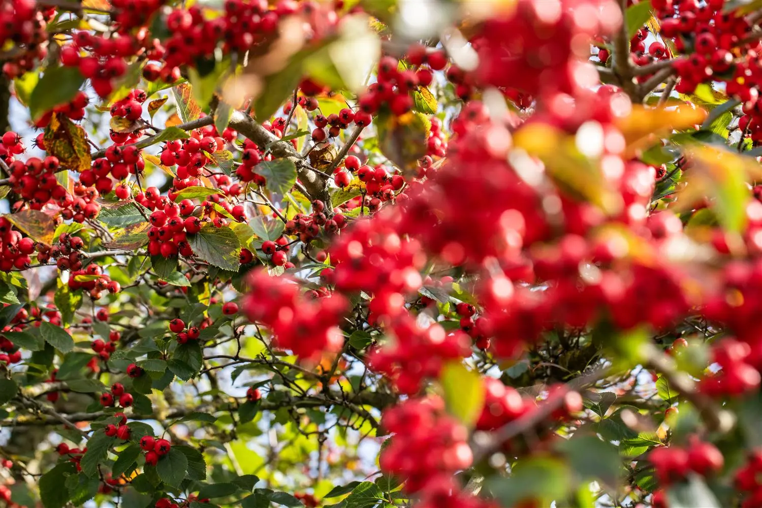 The scarlet-red, round fruits of Crataegus persimilis are particularly decorative. These appear from September.