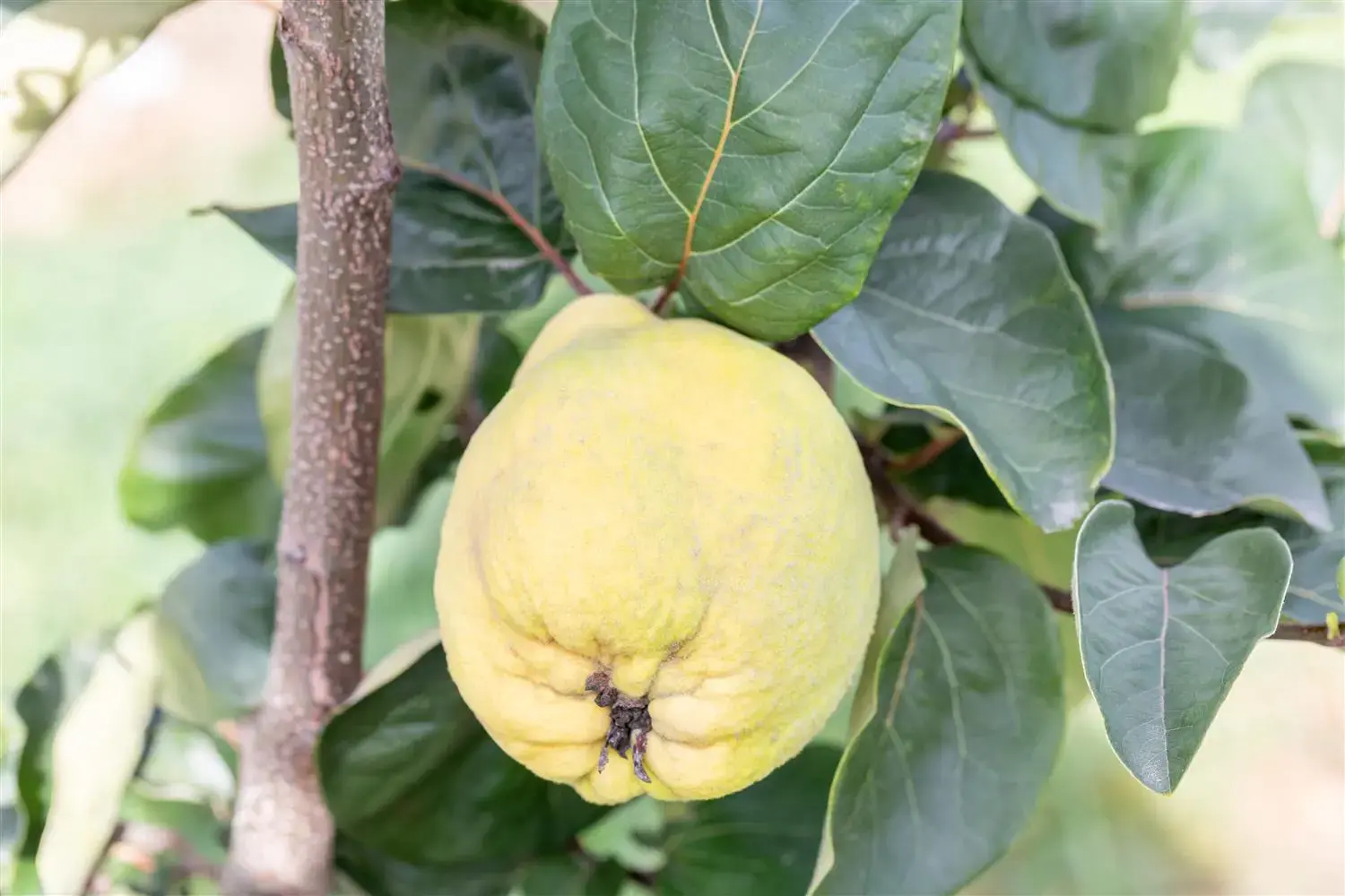 The Common quince 'Mammouth' (Cydonia oblonga) produces golden yellow, firm and fine fruits. They are pear-shaped. Well-drained, nutrient-rich soil and a sunny to semi-shady location create the ideal conditions for a high-yielding harvest from mid-September. Its light pink flowers are a beautiful sight. With its upright and broad growth, Common quince 'Mammouth' grows to around 5 metres high and 6 metres wide.