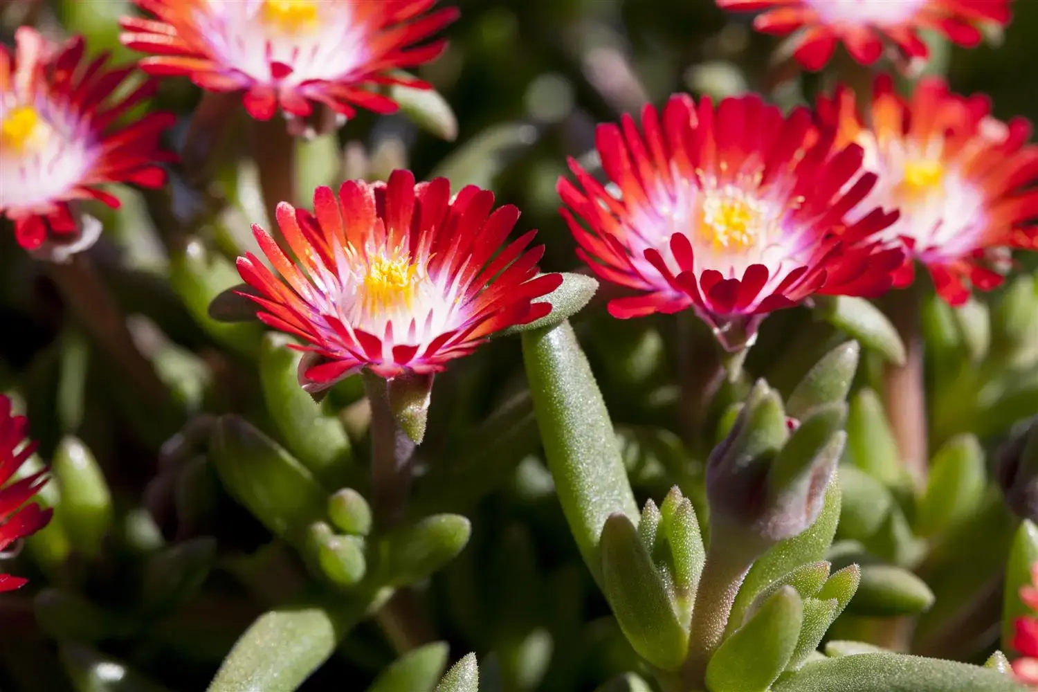 Delosperma cooperi 'Jewel of Desert Grenade' forms radial, capitate, red-white flowers from June.