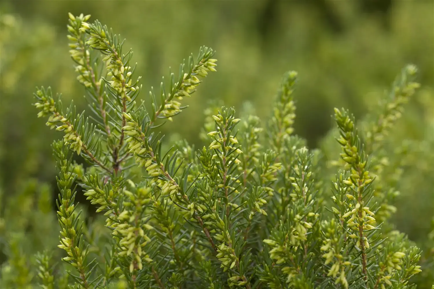 The evergreen leaves of Darley Dale heath 'White Perfection' are medium green, needle-shaped. Yellow shoots.