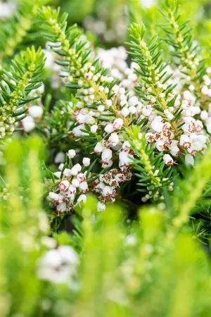 Cornish heath 'Alba' is a bushy and cushion-forming dwarf shrub that can reach a height of 30 - 50 cm and a width of 20 - 50 cm.