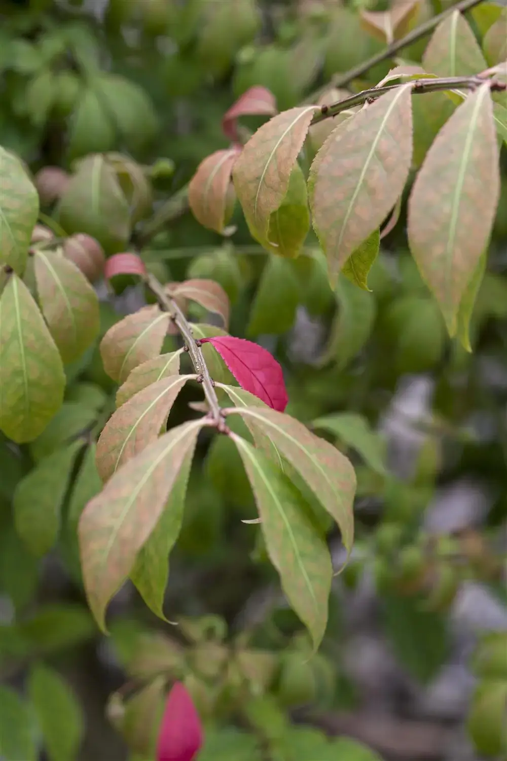 The Winged spindle 'Compactus' (Euonymus alatus) is an upright, broad, dense small shrub with decorative, orange-red fruits. It produces greenish-yellow flowers arranged in clusters from May to June. The Winged spindle 'Compactus' also has egg-shaped, medium-green leaves. In a sunny to semi-shady location with well-drained, nutrient-rich soil, it usually reaches a height of approx. 1.5 metres and grows to a width of approx. 2 metres.