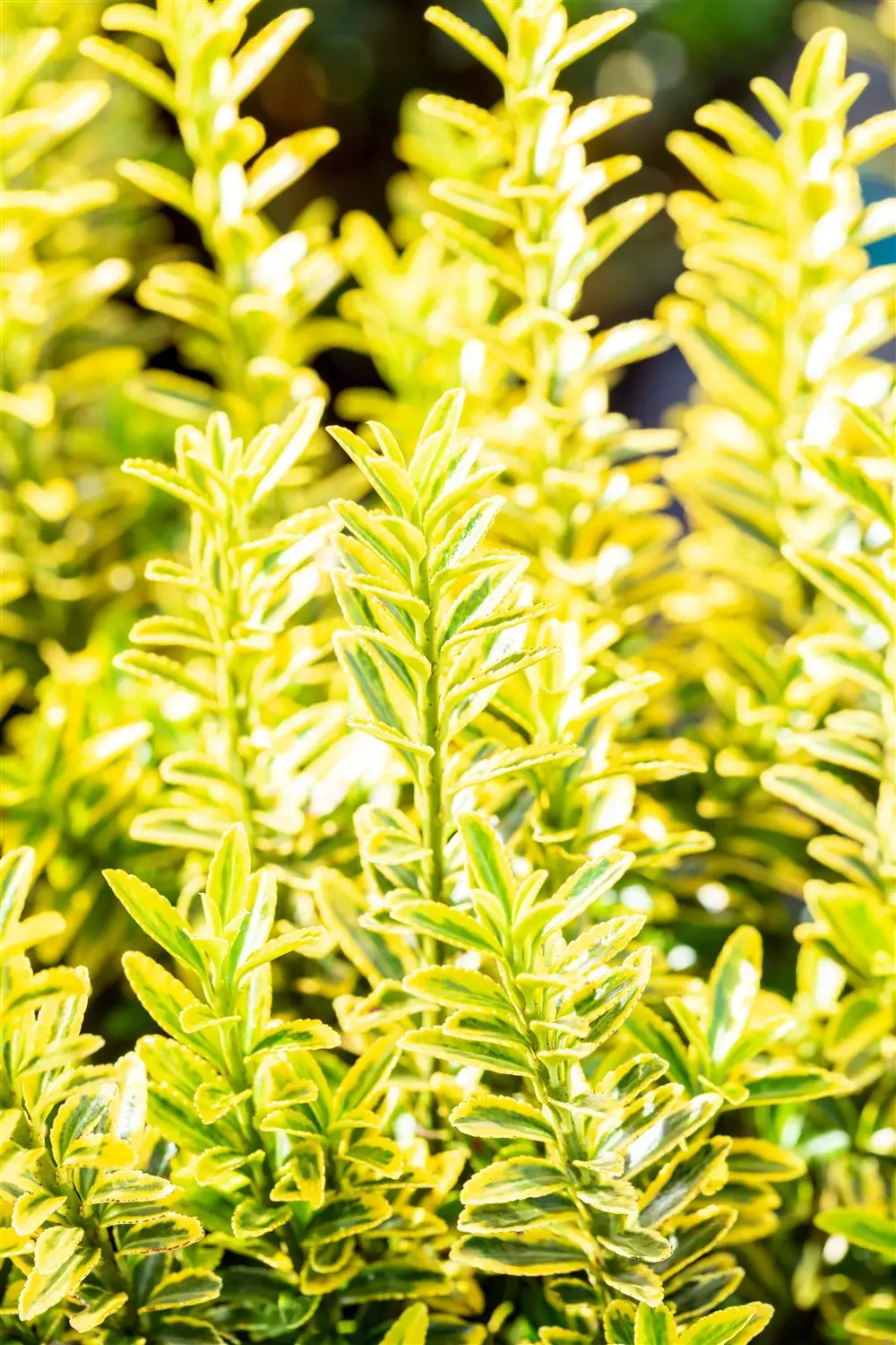 The Japanese spindle 'Microphyllus Pulchellus' (Euonymus japonicus) is a compact small shrub with decorative, pink-coloured fruits. It produces light green, wheel-shaped flowers arranged in umbels from April to August. The Japanese spindle 'Microphyllus Pulchellus' also has egg-shaped, yellow-coloured leaves. In a sunny to semi-shady, wind-protected location with well-drained, nutrient-rich, weakly acidic soil, it usually reaches a height of approx. 1 m and grows to approx. 1 m wide.