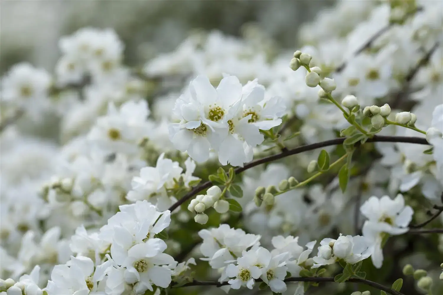 Pearl bush 'The Bride' is an upright and loosely growing shrub. It usually reaches a height of 1.5 - 2 m and is approx. 1.5 - 2 m wide. It usually grows 10 - 30 cm per year.